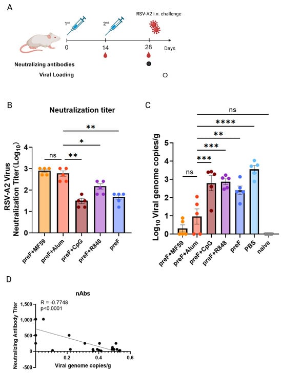 Serum neutralizing antibody titers correlate with protection against RSV−A2 challenge. (A) Experimental schematic for (B–D). The solid dot represents the timepoint of neutralizing antibody detection and the hollow dot represents the timepoint of lung viral loads detection. Balb/c mice (8–10 weeks old, female) were subjected to two immunizations, with the prime administered on day 0 and the boost on day 14. Serum was collected on day 28 post-prime for neutralizing antibody quantification assays. On day 29, mice were intranasally challenged with RSV-A2, and lungs were harvested for viral load quantification 4 days post-challenge. (B) RSV-A2-specific serum neutralizing antibody titers measured pre-challenge. (C) Viral genome copies per gram of lung tissue quantified by qPCR targeting the RSV N gene. (D) Pearson correlation between neutralizing antibody titers and lung viral loads. Representative data from two independent experiments, each with five mice per group (means ± SEM). **** p < 0.0001, *** p < 0.001, ** p < 0.01, * p < 0.05, ns (not significant) by one-way ANOVA.