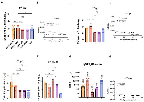 To explore whether binding antibodies were linked with efficacy, we assessed the titer of pre-F-specific binding IgG post-first and -second immunization, as well as IgG1 and IgG2 titer post-second immunization. The mice were from Figure 1. The results showed that no significant differences in pre-F-IgG titers post-first immunization were observed among the groups immunized with pre-F combined with MF59, CpG, or R848 adjuvants compared to the Alum+pre-F group (p > 0.05) (Figure 2A) and IgG titer post-first immunization showed a low negative correlation coefficient (r = −0.3136) with viral loads (Figure 2B). Concurrently, pre-F-IgG titers post-second immunization in the MF59+pre-F, Alum+pre-F, and pre-F alone groups elicited the highest titers, with no significant difference between them (p > 0.05; Figure 2C). The Alum+pre-F group had significantly higher IgG titers than the CpG+pre-F group (p < 0.05) and R848+pre-F group (p < 0.05) (Figure 2C). The IgG titer post-second immunization had a mediate negative correlation coefficient (r = −0.5036) with viral loads (Figure 2D). This indicated that the early binding of IgG was less related to protection efficacy until post-second immunization.