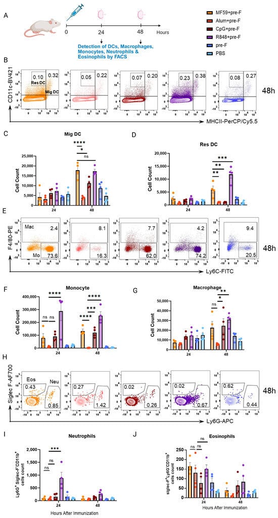 Neutrophils (CD11b+Ly6G+Siglec-F−) showed a transient increase only in the R848+pre-F group at 24 h, which rapidly declined to baseline levels by 48 h; no significant changes were observed in other groups over this period (Figure 3H,I). In contrast, eosinophils (CD11b+Ly6G−Siglec-F+) were significantly increased by all adjuvanted groups compared to controls at 24 h and rapidly declined by 48 h. Alum+pre-F was no different to MF59+pre-F and R848+pre-F (Figure 3J).