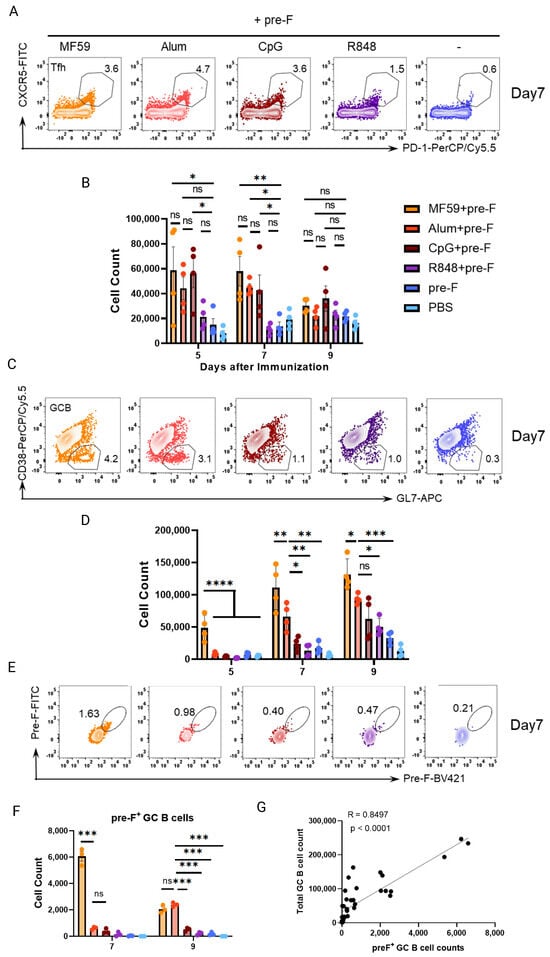 Adjuvant−induced GC B cell responses align with enhanced protection. Balb/c mice were immunized subcutaneously with 10 μg pre-F trimer and various adjuvants. dLNs were harvested at days 5, 7, and 9 post−immunization for flow cytometry. The orange dots: MF59+pre−F; The red dots: Alum+pre−F; The brown dots: CpG+pre−F; The purple dots: R848+pre−F; The blue dots: pre−F alone; The light blue dots: PBS control. (A,B) Representative flow plots (A) and quantification (B) of CD3+CD4+PD-1+CXCR5+ Tfh cells in dLN. (C,D) Representative flow plots (C) and quantification (D) of B220+GL7+CD38- GCB cells in dLN. Representative data from two independent experiments, each with four mice per group (means ± SEM). (E,F) Representative flow plots (E) and quantification (F) of pre-F-specific GC B cells in draining LN at days 7 and 9 post-immunization. (G) Pearson correlation between the pre-F-specific GC B cells and total GC B cells. Representative data from two independent experiments, each with three mice per group (in (E–G); means ± SEM). **** p < 0.0001; *** p < 0.001; ** p < 0.01; * p < 0.05; ns (not significant) by one-way ANOVA.