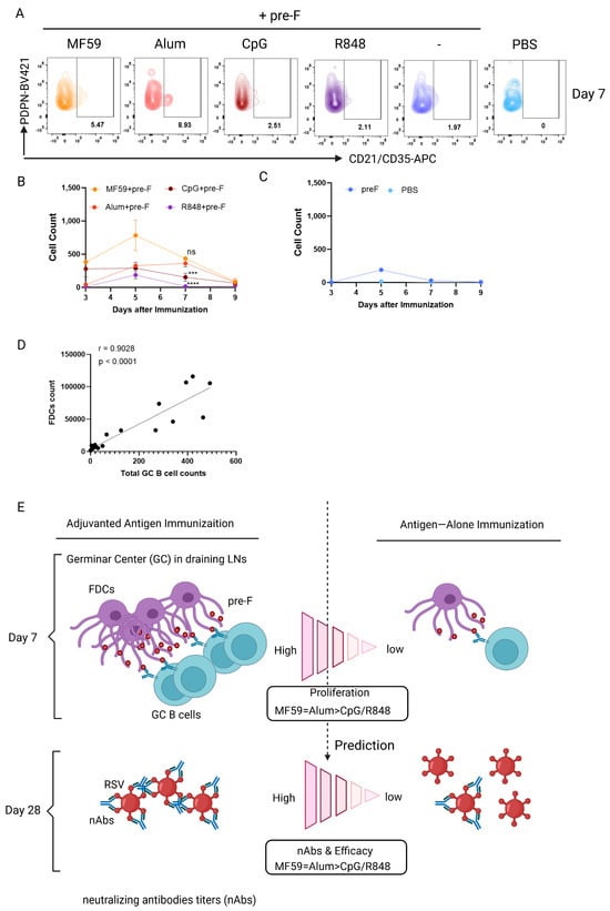 Follicular dendritic cell (FDC) abundance correlates with GC B cell responses. Balb/c mice were immunized subcutaneously with various adjuvants and 10 ug of pre-F trimer and euthanized at days 3, 5, 7, and 9 to isolate dLNs, respectively. FDCs were analyzed by flow cytometry. Representative flow plots (A) and quantification (B,C) of FDCs in draining LN. Live single cells were gated on CD45-B220-CD31-PDPN+CD21/CD35+ for FDCs (the gating strategy is shown in Supplementary Figure S3). (D) Pearson correlation between the FDCs and total GC B cells. (E) Schematic illustrating the prediction of adjuvant-elicited neutralizing antibody efficacy based on early germinal center responses. Data shown are means ± SEM from two independent experiments (n = 3 mice/group). **** p < 0.0001; *** p < 0.001; ns (not significant) by one-way ANOVA.