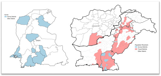 The scope of districts where surveys were conducted and the travel history of survey participants within different districts of Pakistan.