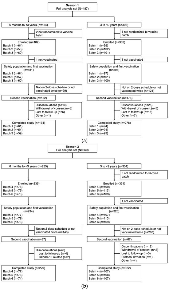 A total of 487 children were enrolled in Season 1 (184 aged 6 months to <3 years and 303 aged 3 to <9 years), and 569 children were enrolled in Season 2 (235 aged 6 months to <3 years and 334 aged 3 to <9 years). The safety populations for each age group included 181 and 298 children, respectively, in Season 1, and 234 and 326 children in Season 2 (Figure 1).