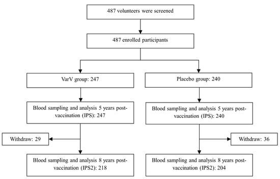 The 5-year immune persistence set (IPS) comprises individuals who provided blood samples and had valid varicella antibody titer measurements available five years after vaccination. The 8-year immune persistence set (IPS2) consists of participants from the IPS who completed an additional blood collection eight years post vaccination, with valid varicella antibody titer measurements also obtained.