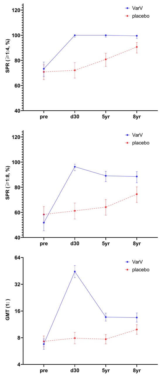 Compared to 30 days post-vaccination, antibody levels significantly declined at 5 and 8 years after a single dose of VarV vaccination; however, they remained higher than pre-vaccination levels. Additionally, compared with the 5-year time point, the seropositive rates for varicella antibodies (≥1:4 and ≥1:8) as well as GMTs in the VarV group remained largely stable at 8 years post-vaccination (Figure 2 and Table S2).