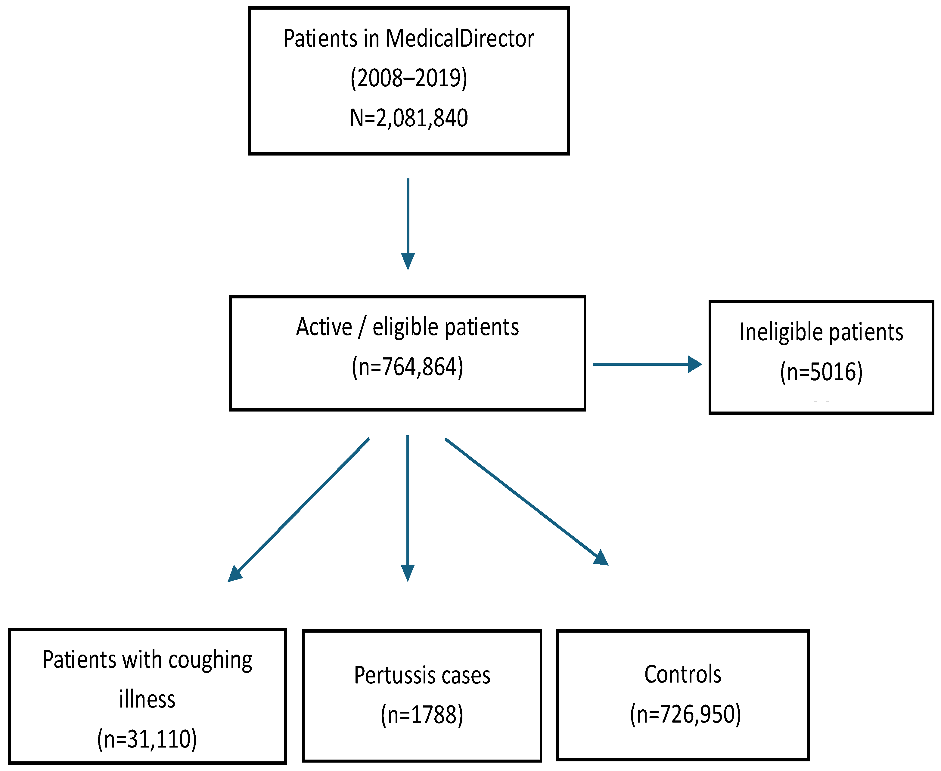 Active/Eligible Patients in the Study * (N) | Diagnosed Pertussis **, n | Patients with Coughing Illness ***, n | Controls #, n | |