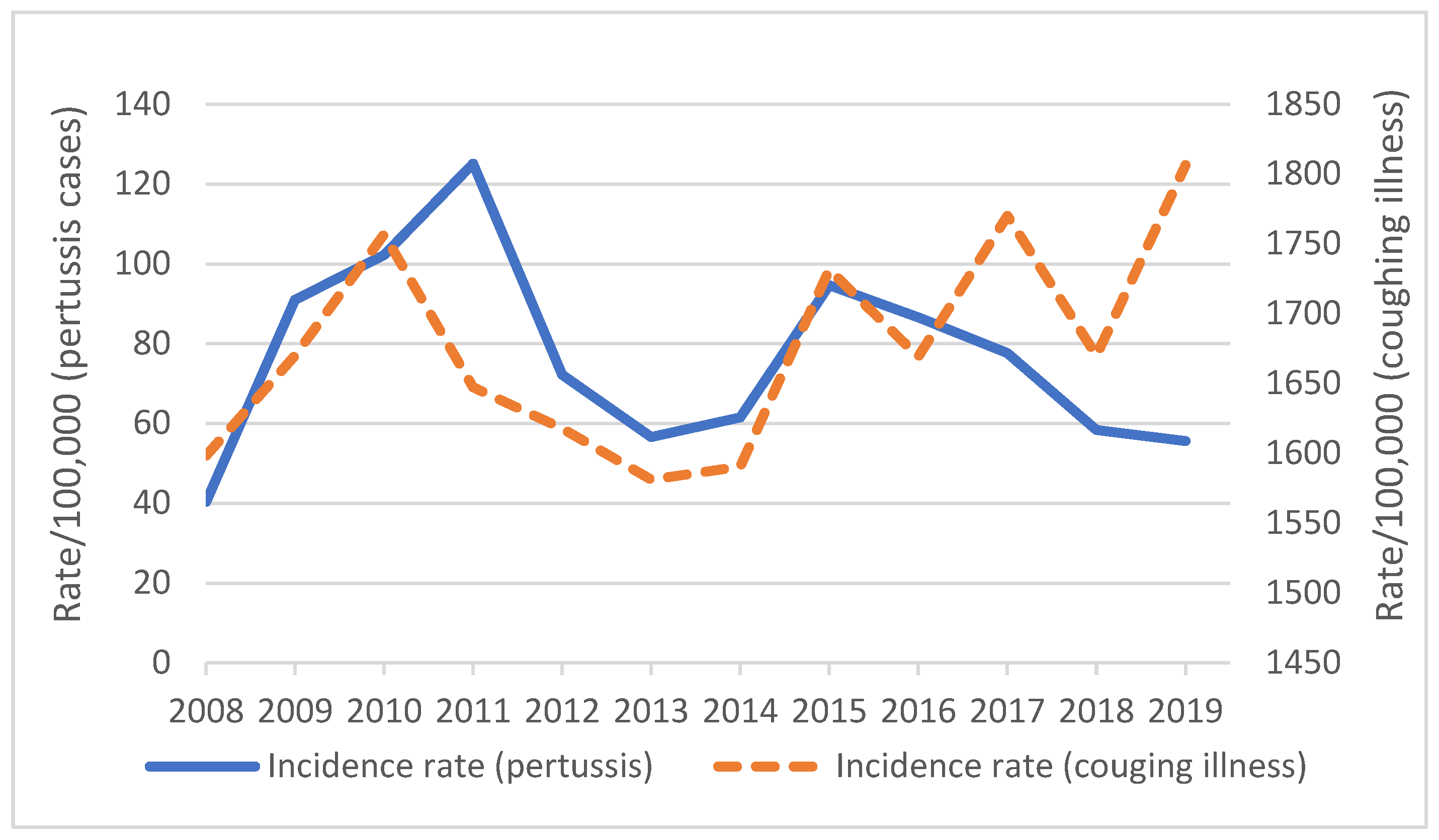 - Kaczmarek, M.C.; Valenti, L.; Kelly, H.A.; Ware, R.S.; Britt, H.C.; Lambert, S.B. Sevenfold rise in likelihood of pertussis test requests in a stable set of Australian general practice encounters, 2000–2011. Med. J. Aust. 2013, 198, 624–628. [Google Scholar] [CrossRef] [PubMed]