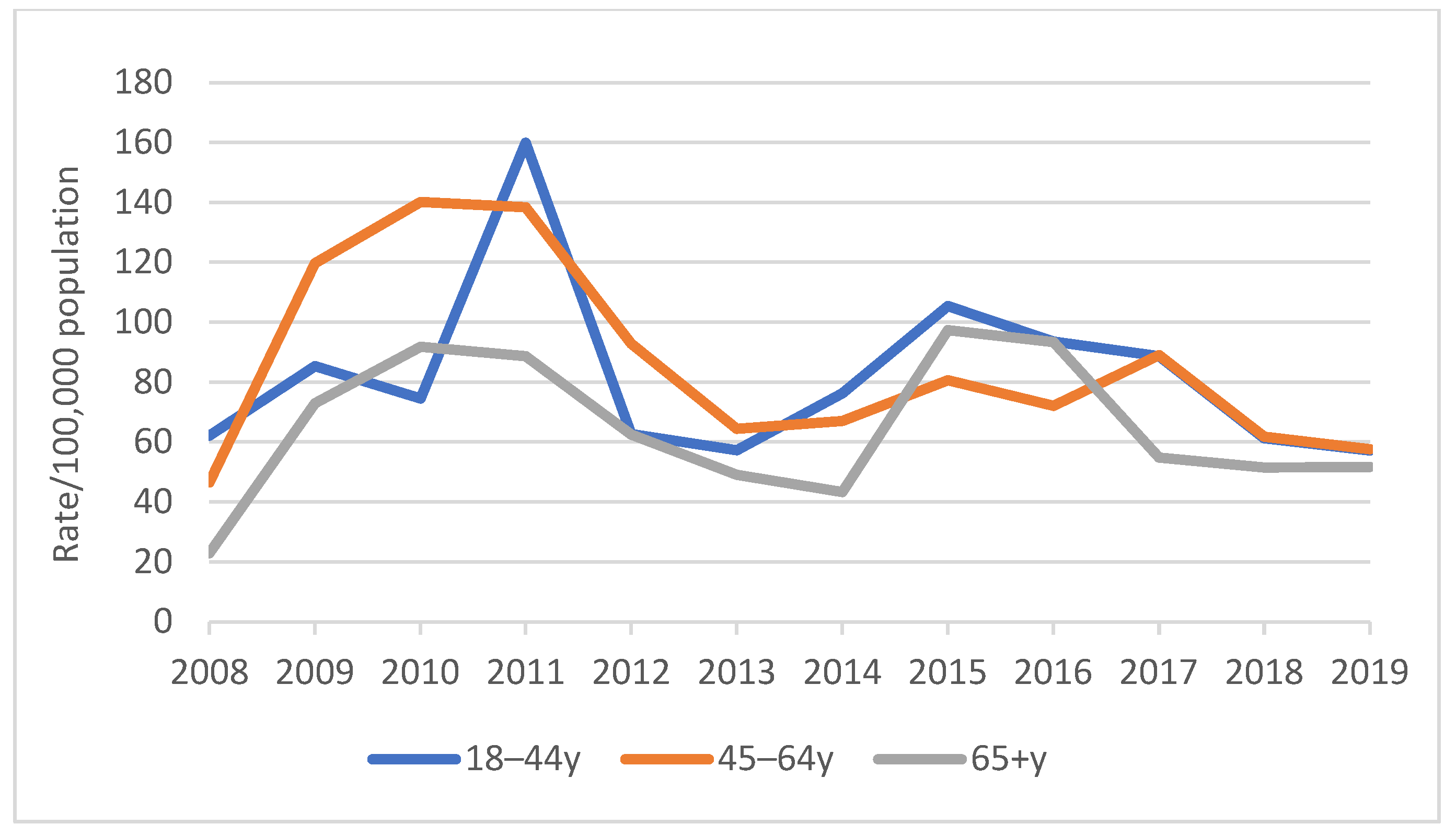 Recorded rate of vaccination, adults all ages, 2008–2019 | ||||