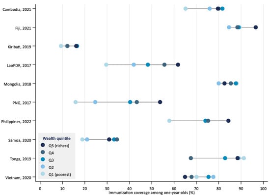 Several limitations must be acknowledged. First, the analysis included less than half of the countries in the Region that had available disaggregated data post-2015, and, therefore, the findings may not be generalizable to countries without recent or high-quality data. Second, household surveys, such as the DHS and MICS, are subject to recall bias and may underrepresent hard-to-reach populations, potentially underestimating true inequalities. Relatedly, the proportion of vaccination data based on records versus caregiver recall varied across countries, which may affect the comparability and robustness of estimates. These differences in data sources highlight the importance of cautious interpretation, as reliance on recall may introduce additional bias in some settings. Third, differences in survey design and implementation may limit the comparability of results across countries and time. Finally, the use of wealth quintiles captures relative economic position within countries but may not fully reflect multidimensional poverty or intersecting inequities (e.g., by geography, ethnicity, or maternal education). Importantly, the DHS and MICS wealth index is constructed from household assets, dwelling characteristics, and access to basic services, and does not directly include access to health services, reducing the risk of circularity in the findings. Further studies should investigate immunization inequalities by other dimensions, as well as how these factors intersect with each other. Of particular relevance to the Western Pacific Region are geographic barriers, especially in Pacific island countries, where populations are dispersed across remote outer islands. In such settings, supply-side challenges—including limited cold-chain capacity, irregular transport links, and constrained health workforce availability—can make timely vaccine delivery difficult and dependent on infrequent outreach visits [37,38].