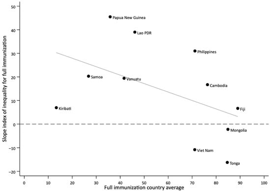 Relationship between national average and wealth-based inequalities in immunization coverage as measured with the slope index of inequality (SII) in countries of the Western Pacific Regions, latest year.