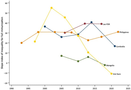 In countries with longitudinal data (n = 5), trends in wealth-based inequalities in full immunization coverage, as measured by the SII, varied over time (Figure 3). Lao PDR and Philippines showed persistently high levels of inequality across survey years, with increased inequality gaps over time. In Cambodia and Mongolia, inequalities initially fluctuated but decreased in the latest survey. By contrast, Viet Nam showed marked reductions in inequality over time. In the latest survey, no wealth-based inequalities were observed in Mongolia and Viet Nam.