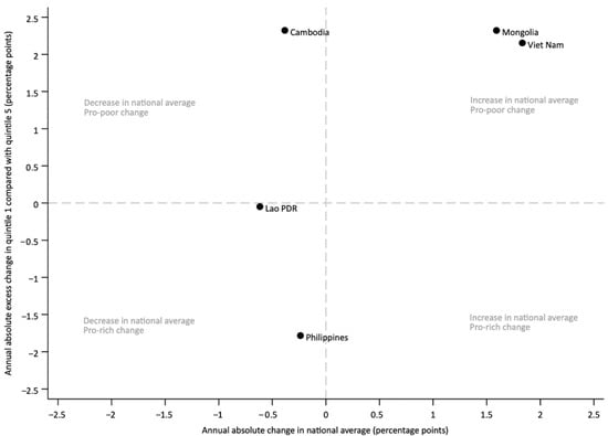 We calculated trends in inequality patterns as the annual absolute excess change in the poorest quintile compared with the richest quintile against the annual absolute change in the national average. For each quintile, we estimated the annual pace of change by dividing the coverage difference between the latest and earlier data points by the number of years separating them. We then subtracted the richest quintile’s annual change from that of the poorest, obtaining the annual excess change (in percentage points). A positive excess change indicates a pro-poor trend, where coverage grew faster in the poorest quintile. A negative value indicates a pro-rich trend, with faster gains in the richest quintile [15,25].