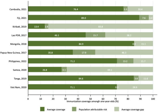 Population attributable risk for the potential reduction in the national immunization coverage gap by eliminating wealth-based inequalities in countries of the Western Pacific Region, latest year.