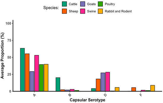 P. multocida infects a wide range of hosts. Expressions of different capsular serotypes and virulence genes may show differences across different animals. Accordingly, capsular type A strains had a high level of adaptation to bovine and poultry species. In swine, there were capA and capD strains. A high number of capD-positive strains were found in small ruminants. Additionally, capF was found on wild-type strains isolated from diseased cattle. From these reports, none of the isolates incorporated capE, while all strains of capB originated solely from buffaloes. Even though there is a significant difference in proportion, most combinations of genes encoding outer membrane proteins, colonization factors, iron acquisition factors, and superoxide dismutase have no basic differences regarding host specificity. In general, virulence genes do not exhibit host specificity [2,11,23,35,36,37]. The frequency of isolation capsular serotype versus host relationship is shown in Figure 1.