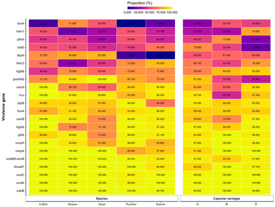 Faceted heatmap of virulence—gene proportions across host species and capsular serotypes. Each tile displays the mean percentage of isolates positive for a given virulence gene within a species group (Cattle, Sheep, Goat, Poultry, and Swine) or within a capsular serotype (A, B, and D). Values were computed by expanding multi-valued cells, parsing numeric content, excluding missing entries, averaging within each gene–category cell, and constraining results to the valid range of 0.000–100.000. Virulence genes are ordered by their overall mean prevalence across both facets to aid comparability. Sources for Figure 2: [12,22,34,36,46,47,48,49,58,59]. Notes: (ref. [12]) reported only for sheep; (refs. [47,59]) reported only for swine; (ref. [22]) reported only for swine and poultry of serogroups A and D; (ref. [49]) reported only for sheep and goats; (ref. [48]) reported only for goats; (ref. [58]) reported only for avian species and sheep.