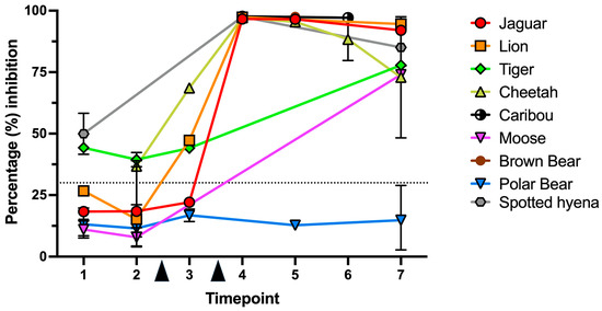 Percentage of surrogate virus neutralization in sera from animals vaccinated at the Toronto Zoo with the Zoetis® Experimental Mink Coronavirus Vaccine (Subunit). All the single-animal data in the cohort are grouped at the species level, including replicates within the same timepoint. Timepoints are defined as time intervals relative to the prime and booster doses (arrowheads). Represented are either single values, or median with range, when multiple values were available for each timepoint. Dotted line is placed at 30% of inhibition, the neutralization threshold according to the Genscript® kit.