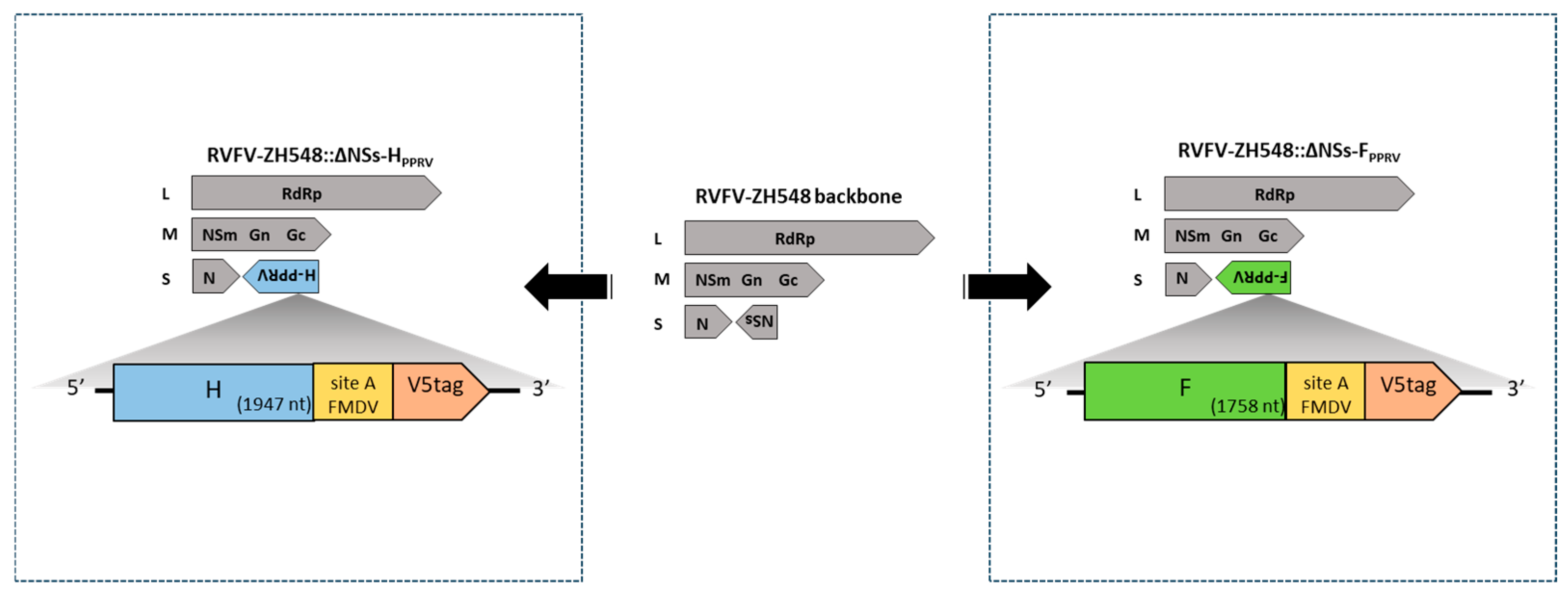 Peste des petits ruminants virus (PPRV) is a Morbillivirus of the Paramyxoviridae family that mainly affects domestic and wild ruminants. PPRV is the etiological agent of peste des petits ruminants (PPR or goat plague), a disease that causes substantial economic losses, with greater consequences in developing countries across Africa, the Middle East, and Asia where it is considered to be endemic. Mass vaccination is considered an effective way to control the spread of the disease, as was proven during the 2009–2011 campaigns in Morocco [6], which suppressed the virus until June 2015. Currently, live-attenuated PPR vaccines are being used in endemic regions [7] and inactivated vaccines are used in the rest of the countries [8]. Live-attenuated PPR vaccines induce a high level of protection for at least three years [9], but they carry the risk of reversion to virulence. On the other hand, inactivated vaccines are a safer choice, but they do not induce an immunity as good as live attenuated vaccines. Therefore, the development of improved vaccines that are safe and have DIVA properties (differentiation of infected from vaccinated animals) is a necessary step to improve the quality of the prophylactic measures. The development of DIVA vaccines would also facilitate the global PPR eradication program launched by the World Organization for Animal Health (WOAH, formerly OIE) in 2014 [10], since the DIVA strategy allows veterinary authorities to distinguish between naturally infected animals and those that are properly vaccinated. This capability supports targeted surveillance, safe trade practices, and outbreak containment, without penalizing vaccinated livestock. In this regard, recombinant vectored vaccines represent an ideal platform for DIVA implementation. In the case of PPRV, there are already several recombinant viral vectors, either poxvirus, herpesvirus, or adenovirus, that express PPRV proteins and can induce immunity and protection [11,12]. In addition to these well-established vaccine platforms, RVFV can also be engineered to support the expression of foreign antigens [13]. Previously, we also demonstrated that recombinant RVFV can express bluetongue virus antigens [14] that were able to elicit specific and protective immune responses in vivo. Similar approaches for other veterinary viral pathogens have been reported, such as a turkey herpesvirus vaccine against avian influenza and Newcastle disease [15] or a multivalent capripoxvirus-vectored vaccine [16].