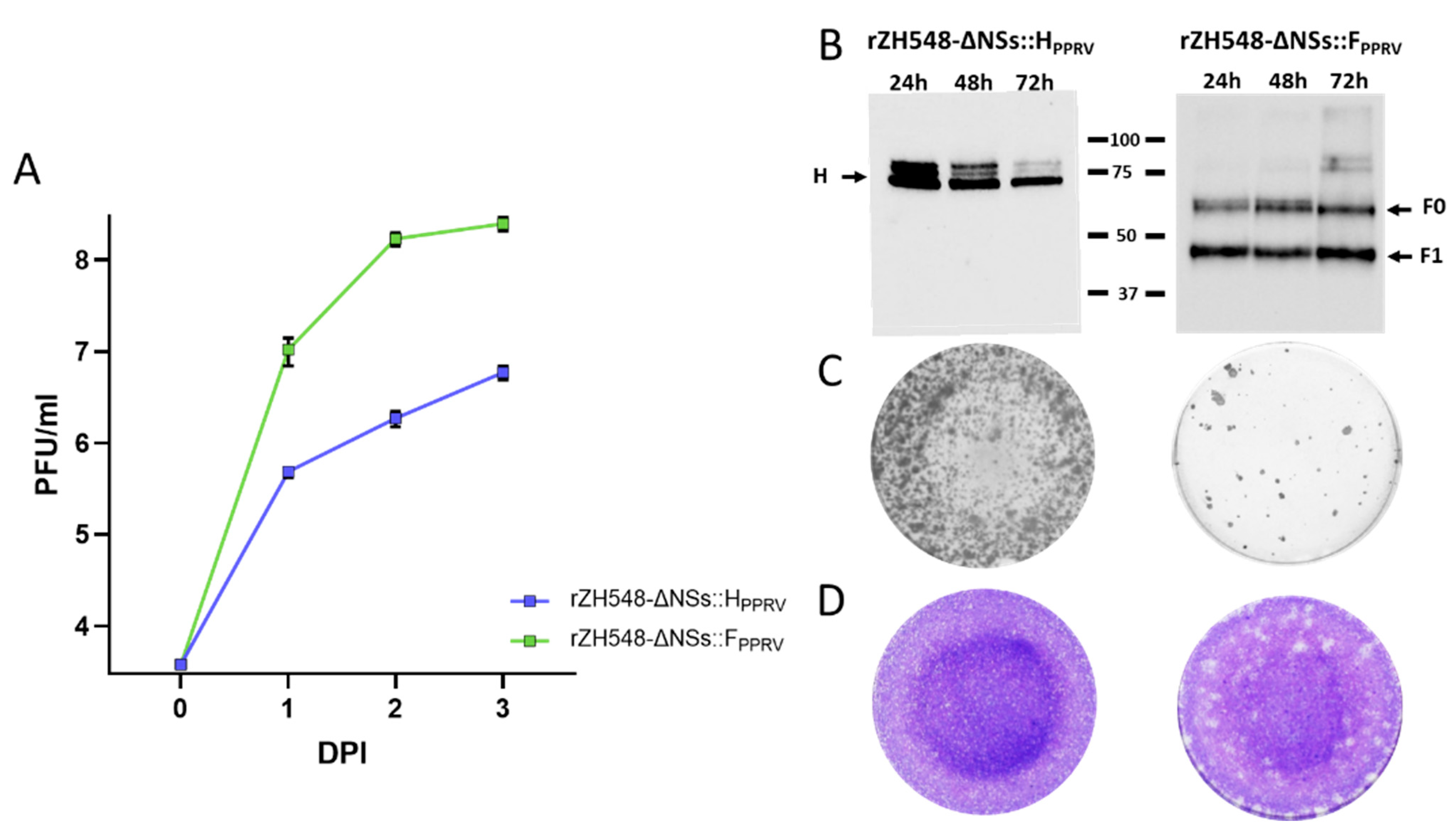 Figure 2. Characterization of rescued RVFVs. (A) Growth kinetics of rZH548-ΔNSs::HPPRV and rZH548-ΔNSs::FPPRV. Vero cells were infected with an MOI of 0.01, and supernatants were harvested at the indicated time points (days post-infection). Viral titers (mean ± SD) were determined by plaque assay upon infection of Vero cells with serial dilutions of the supernatants. Titrations were performed in duplicates. (B) Western blot analysis of rZH548-ΔNSs::HPPRV- or rZH548-ΔNSs::FPPRV-infected Vero cells at different times post-infection. Anti-V5tag mAb was used for the detection of either H or F recombinant proteins. The arrows point to the detection of F0 (unprocessed), F1 (processed), and H proteins. (C,D) Plaque phenotypes of the rescued recombinant viruses. Cell lysis was visualized at 3–5 days post-infection: immunostaining with anti-N mAb 2B1 (C) or Crystal violet staining (D).