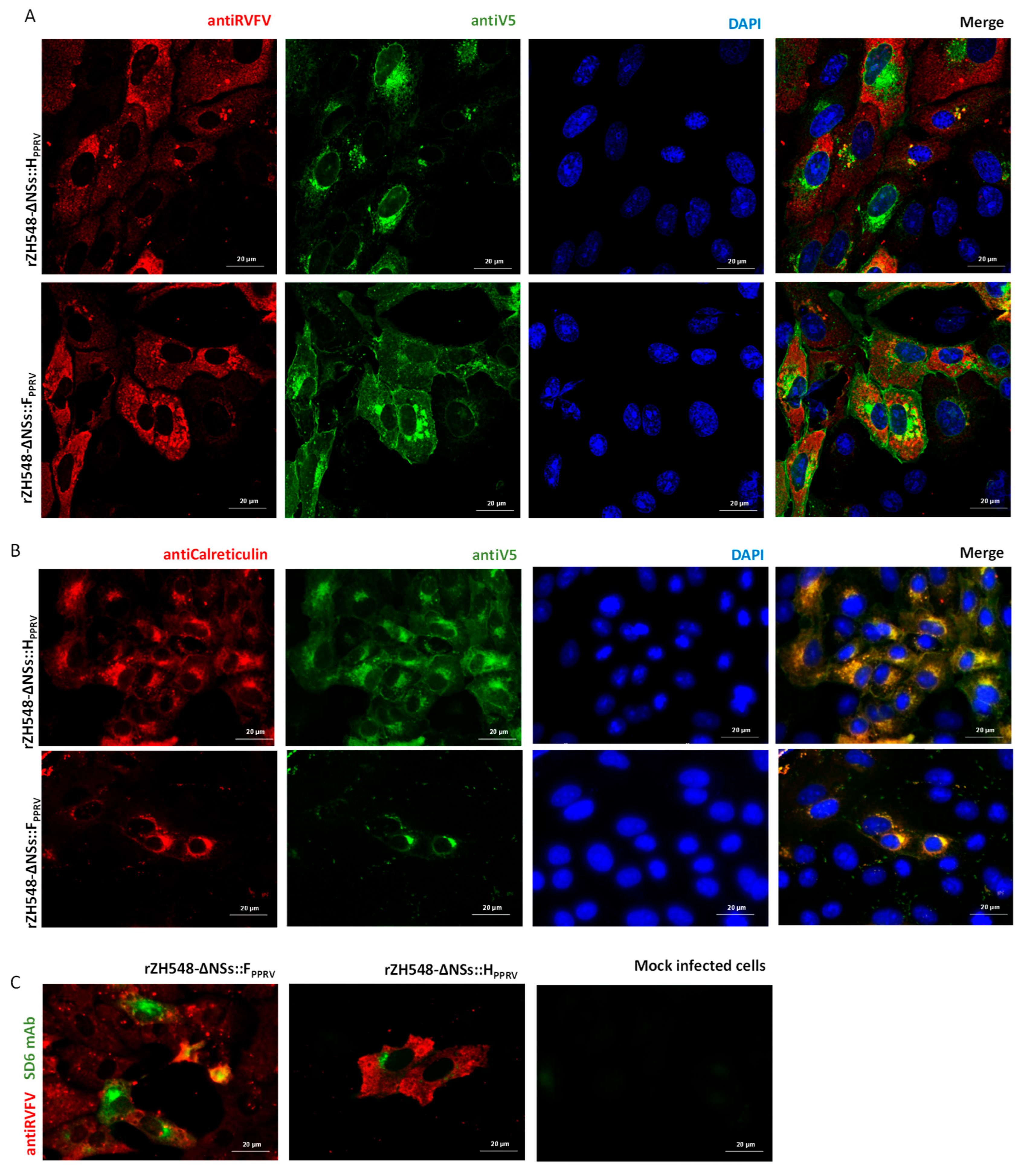 Figure 3. Detection of recombinant PPRV transgene expression in RVFV-infected Vero cell cultures. (A) Indirect immunofluorescence assay (IFA) of rescued recombinant RVFVs in infected Vero cells. RVFV antigens were visualized using a rabbit polyclonal anti-RVFV serum (red fluorescence), while expression of the PPRV H and F proteins was detected using a mouse anti-V5 epitope antibody (green fluorescence). (B) Representative images showing the subcellular localization of the recombinant H and F proteins in infected cells. H and F antigens were detected with anti-V5tag antibody (green fluorescence) and anti-calreticulin (red fluorescence) used to localize ER. DAPI staining was used to show cell nuclei. Magnification 63×. (C) Detection of the FMDV site A tag by SD6 mAb (green fluorescence) and RVFV antigens (red fluorescence).