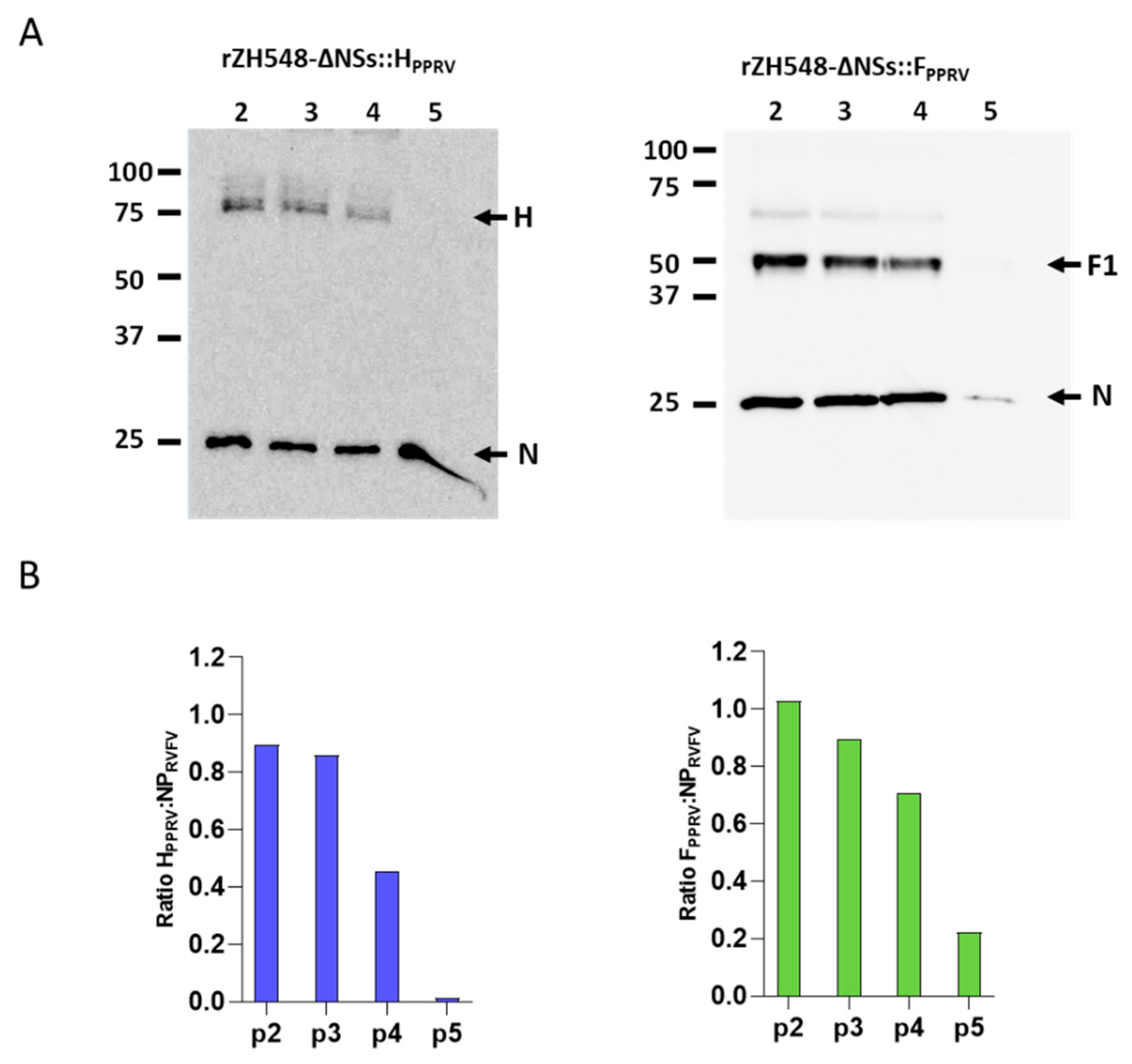Figure 4. Stability of recombinant antigen expression. (A) Expression upon cell passage of rZH548-ΔNSs::HPPRV or rZH548-ΔNSs::FPPRV. Total cell extracts were separated by SDS-PAGE and subjected to Western blot transfer. Anti-V5tag mAb was used for the detection of either H or F recombinant proteins. Anti-N mAb 2B1 was used to detect the expression of RVFV nucleoprotein N. Molecular mass in kDa. (B) Relative detection of H/N or F/N ratios derived from densitometric WB values at different passages.