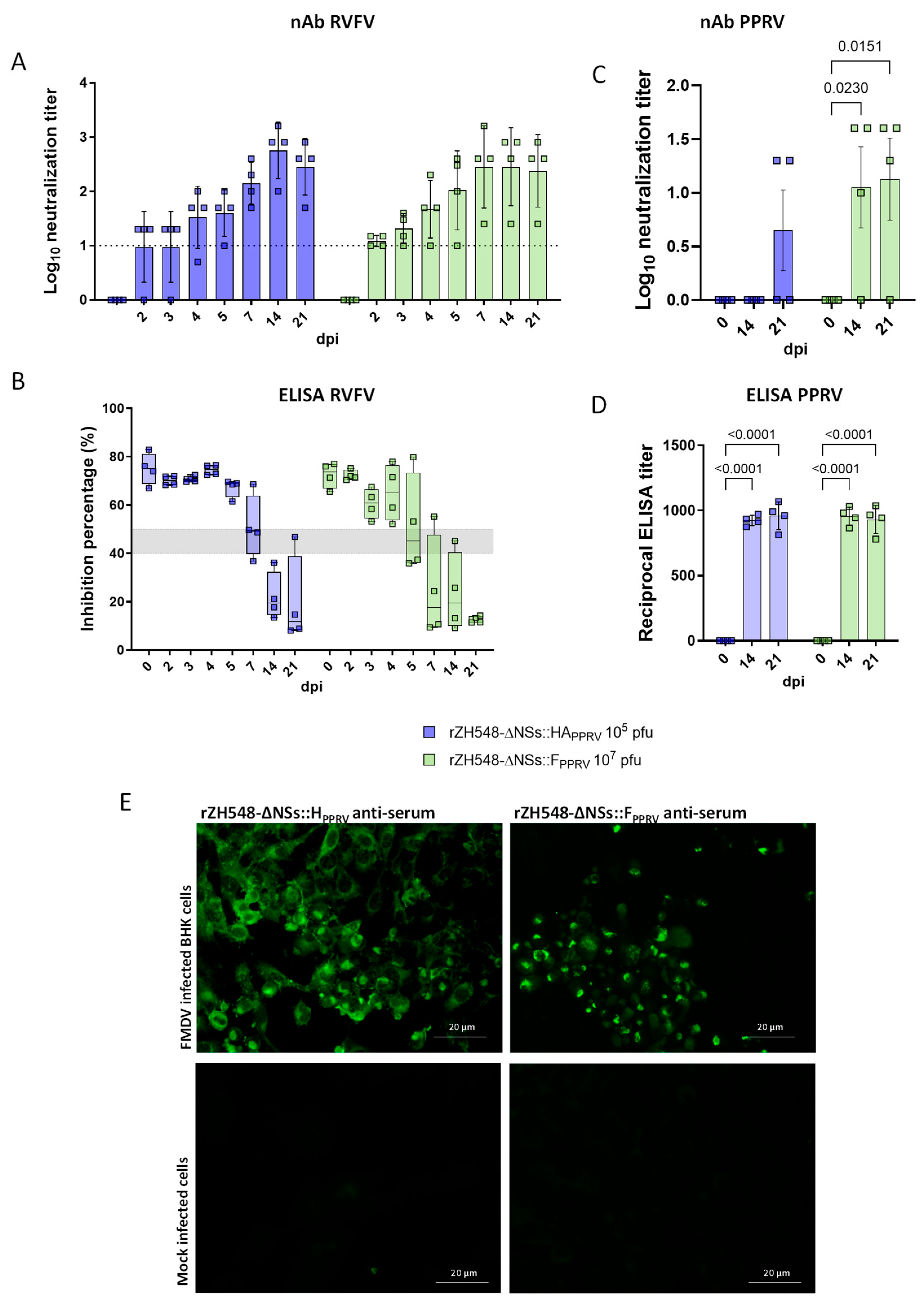 Figure 7. Humoral immune response following single-dose inoculation of sheep with rZH548-ΔNSs::HPPRV or rZH548-ΔNSs::FPPRV. (A) Kinetics of RVFV-specific neutralizing antibody induction post-vaccination, showing titers at different time points. Horizontal dotted line represent assay sensitivity limit. (B) Competition ELISA detection of serum antibodies against RVFV nucleoprotein (N) at 2, 3, 4, 5, 7, 14, and 21 days post-inoculation. Shade area depicts the doubtful range, according to the manufacturer’s instructions (IDVet). (C) Determination of neutralizing antibody titers against PPRV Nigeria 75/1 for the same groups described in panel A, expressed as the log10 of the highest serum dilution that inhibited 100% of virus-specific cytopathic effect in 96-well flat-bottom plates. (D) Evaluation of PPRV-specific IgG levels in serum collected at days 14 and 21 by ELISA using Nigeria 75/1 PPRV-coated plates. Results are expressed as 1/X IgG titer for each individual animal. (E) Detection of FMDV-infected BHK-21 cells by indirect immunofluorescence with serum from a sheep inoculated with rZH548-ΔNSs::HPPRV or rZH548-ΔNSs::FPPRV. Data (A,C,D) are expressed as mean ± SEM, with individual values shown as dots. Data (B) is expressed as median with interquartile range, with individual data points representing biological replicates. Significance (C,D) was analyzed using two-way ANOVA.