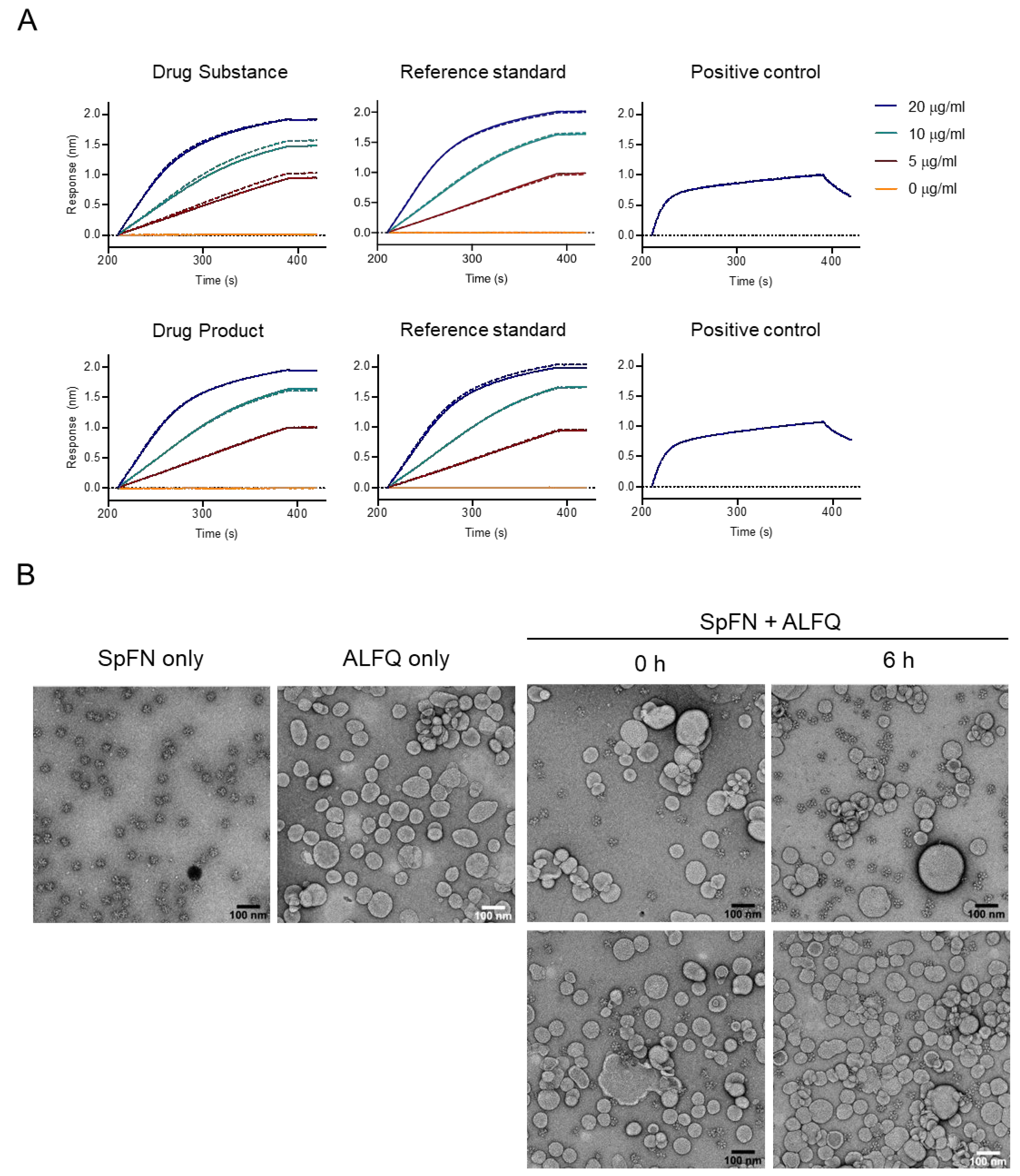 3.2. SpFN Particle Formation and SpFN/ALFQ Liposome Formation Assessment by Negative-Stain EM