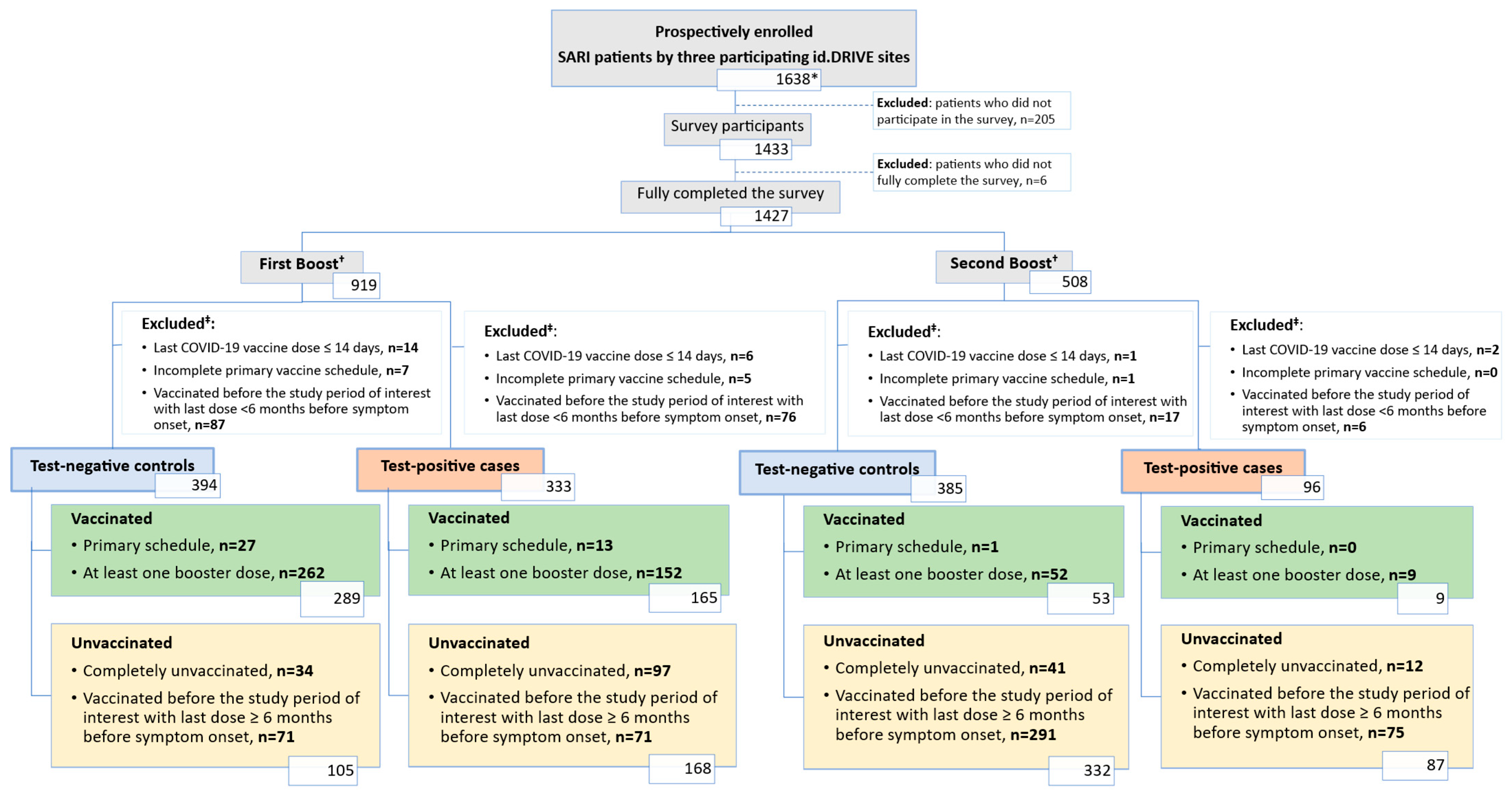 - European Centre for Disease Prevention and Control. Core Protocol for ECDC Studies of COVID-19 Vaccine Effectiveness Against Hospitalisation with Severe Acute Respiratory Infection, laboratory-Confirmed with SARS-CoV-2 or with Seasonal Influenza—Version 3.0. Available online: https://www.ecdc.europa.eu/en/publications-data/core-protocol-ecdc-studies-covid-19-vaccine-effectiveness-3 (accessed on 28 March 2024).