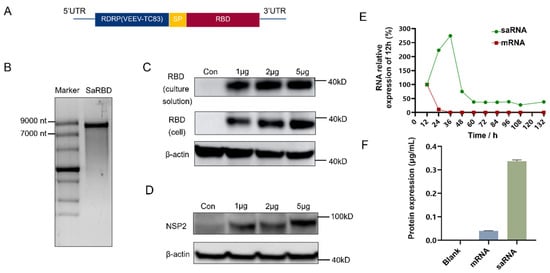 The saRNA sequence (Figure 1A) was ligated into the pcDNA3.1(+) vector to construct the plasmid (P-Sa-RBD), and the linearized template (L-P-Sa-RBD) was obtained. The proportion of supercoiled plasmid and the purity of the linearized template were detected (Figure S1A–C). Using this system, we synthesized saRNA expressing EGFP with different base modifications [23,24,25,26]. Unmodified saRNA demonstrated stronger and longer-lasting expression in 293 T cells (Figure S2). Therefore, we used the unmodified IVT system to obtain saRNA encoding RBD (Sa-RBD) (Figure 1B). The expression of RBD protein and NSP2 protein was detected by Western blot 36 h post-transfection with Sa-RBD (Figure 1C,D). At the same transfection dose of 5 μg, the RBD RNA content in saRNA-transfected cells showed a self-amplifying trend—increasing initially, then decreasing and stabilizing—whereas cells transfected with non-replicating mRNA exhibited no such change in RBD RNA content (Figure 1E). At 36 h post-transfection with equal doses, the RBD protein level in saRNA-transfected cells was significantly higher than in non-replicating mRNA-transfected cells (Figure 1F). These results indicate that the saRNA backbone confers both expression and self-amplification capabilities.