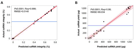 The integrity and yield of the obtained saRNA were detected. Prediction models for integrity and yield were fitted using the Least Squares Method. For the saRNA integrity model: Root Mean Square Error (RMSE) = 0.0148, R-squared (R2) = 0.99838, p = <0.0001 (Figure 2A). For the self-amplifying mRNA yield model: RMSE = 89.034, R2 = 0.98, p = <0.0001 (Figure 2B).