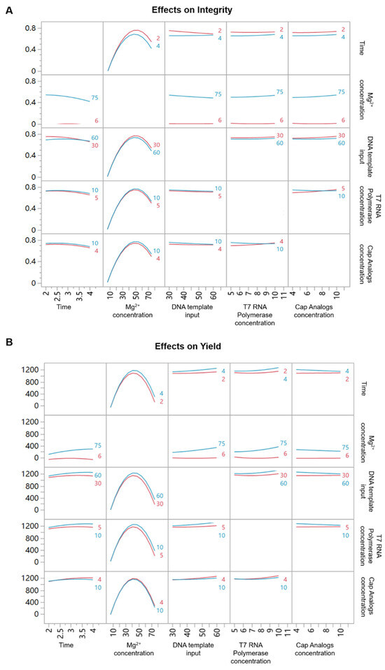 Parameter effects on integrity and yield of saRNA IVT products. (A) Interaction plot of five variables on the integrity of saRNA IVT products. (B) Interaction plot of five variables on the yield of saRNA IVT products. The red lines represent the upper boundary of parameter range, while the blue lines represent the lower boundary.