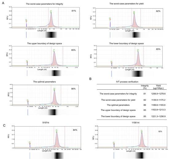 Generally, if the verification results of the extreme worst-case combination parameters from the design space meet the preset criteria, the design space is considered compliant with production requirements. Verification was conducted according to the extreme worst-case combination parameters, the optimal process parameters, the upper and lower boundary combinations of the design space. All results satisfied the preset criteria (Figure 4A,B). Additionally, we applied the optimal process parameters to prepare longer saRNA sequences (9.2k nt, 11.5k nt) to confirm its applicability for longer saRNA. The results showed that IVT products could still meet the preset criteria (Figure 4C).