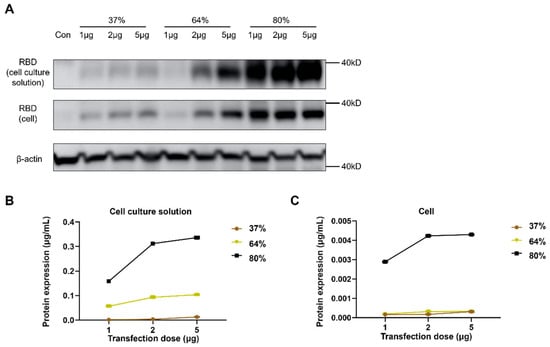 Cells and supernatants were collected 36 h after transfecting 293 T cells with 1 μg, 2 μg, or 5 μg of Sa-RBD at 37%, 64%, or 80% integrity. Target protein expression was detected by Western blot. Under different transfection doses, as integrity increased, the target protein bands in both cells and culture supernatants gradually intensified. At all doses, Sa-RBD with 80% integrity exhibited the strongest protein expression (Figure 5A). In addition, dose-escalation cannot sufficiently compensate for reduced expression levels caused by low-integrity Sa-RBD. The amount of target protein in cells and supernatants detected by ELISA showed consistent trends with the Western blot results (Figure 5B,C).
