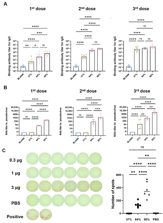Mice were immunized with 3 μg of saRNA vaccines at 37%, 64%, and 80% integrities (Table S2). Two weeks post-immunization, the seroconversion rate for spike protein-specific binding antibodies was 100% in all groups. The 37% integrity vaccine failed to effectively induce pseudovirus neutralizing antibodies. Pseudovirus neutralizing antibody GMTs for the 64% and 80% integrity vaccines were 1:48 and 1:411, respectively. The pseudovirus neutralizing antibody titer induced by the 80% integrity vaccine was 137-fold higher than that of the 37% integrity vaccine (p < 0.0001) and 16.1-fold higher than that of the 64% integrity vaccine (p < 0.0001) (Figure 6A,B). The second and third vaccine doses were administered at 2 weeks and 7 weeks after the first immunization, respectively. Five weeks after the second immunization, GMTs for spike protein-specific binding antibodies in the 37%, 64%, and 80% integrity groups were 1:6906, 1:335865, and 1:973253, respectively. Pseudovirus neutralizing antibody GMTs were 1:3, 1:230, and 1:1172, respectively. The pseudovirus neutralizing antibody titer induced by the 80% integrity vaccine was 390.7-fold higher than that of the 37% integrity vaccine (p < 0.0001) and the 64% integrity vaccine was 76.7-fold higher than that of the 37% integrity vaccine (p < 0.0001). Two weeks after the third immunization, GMTs for spike protein-specific binding antibodies in the 37%, 64%, and 80% groups were 1:696492, 1:1204447, and 1:2982650, respectively. Pseudovirus neutralizing antibody GMTs were 1:73, 1:811, and 1:8083, respectively. The pseudovirus neutralizing antibody titer induced by the 80% integrity vaccine was 110.7-fold higher than that of the 37% integrity vaccine and 9.96-fold higher than that of the 64% integrity vaccine (p < 0.01) (Figure 6A,B).