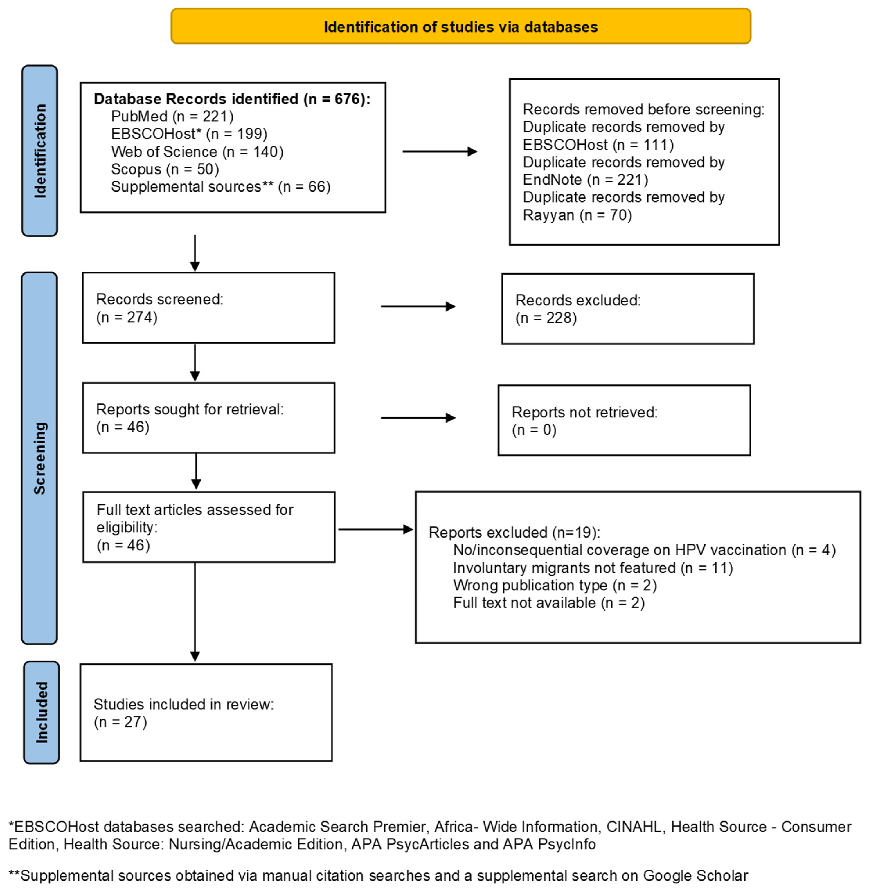 | Outcomes | Health system determinants of delivery and uptake of HPV vaccination services among involuntary migrant populations | Studies that do not include evidence on HPV vaccination service provision-related supply- and demand-side factors |