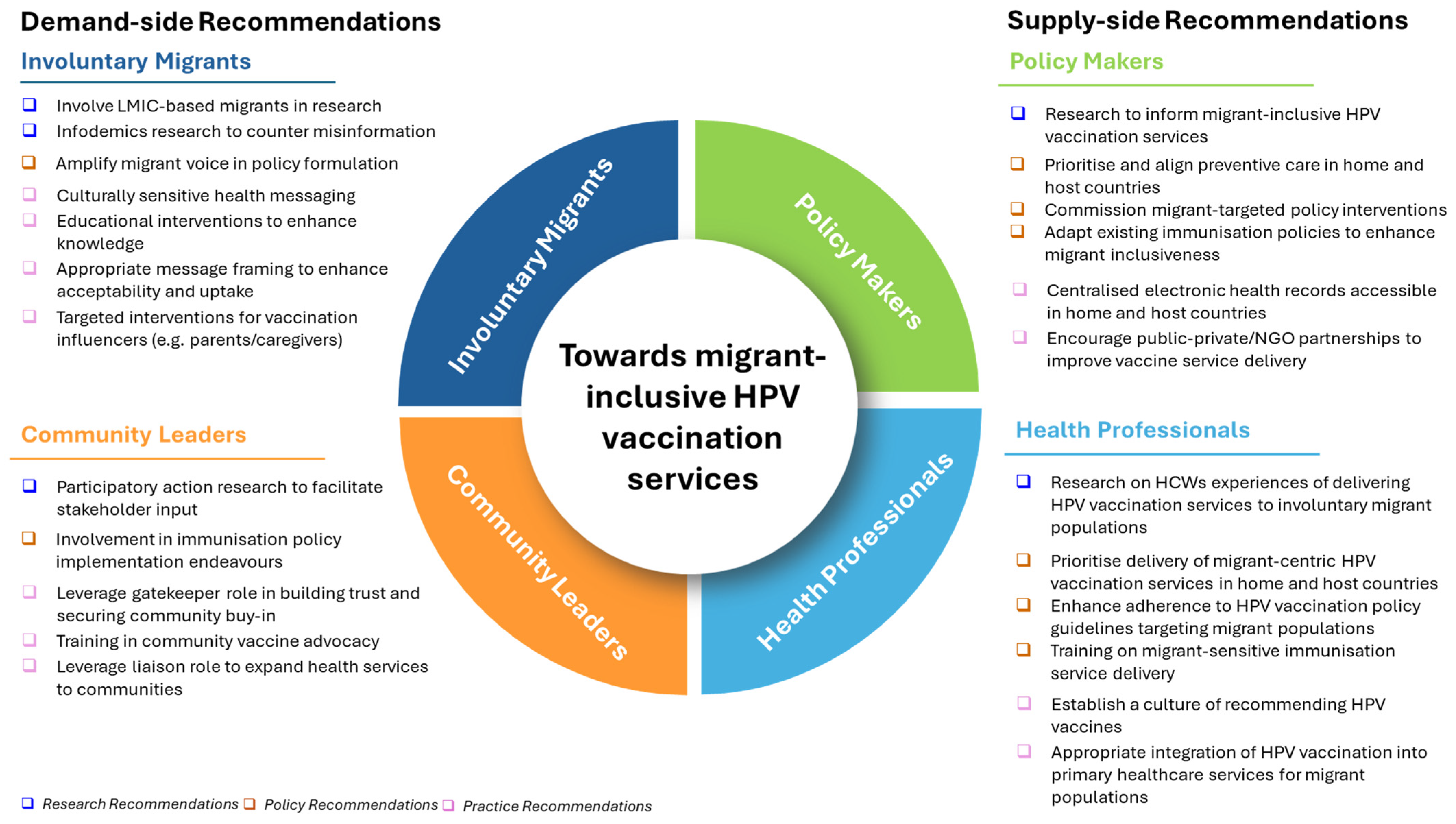 | 1. Leadership/governance | 1.1 policies prioritising migrants’ health needs | 1.1(a) HPV vaccination policies not implemented in some countries |