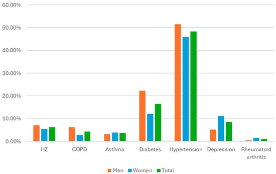 An analysis of the distribution of the different comorbidities in relation to the sex of the individuals revealed that, even though female sex is listed as an independent risk factor for HZ [7,44], we found that the HZ rates were very similar between the sexes and were even slightly higher in men (7.07% vs. 5.52% in women). The prevalence of COPD was significantly greater in men (6.26%) than in women (2.76%), as was the prevalence of diabetes (22.22% in men vs. 12.12% in women). The prevalence of depression, however, was greater in women (11.04%) than in men (5.25%). These findings are summarised in Table 4 and Figure 2.