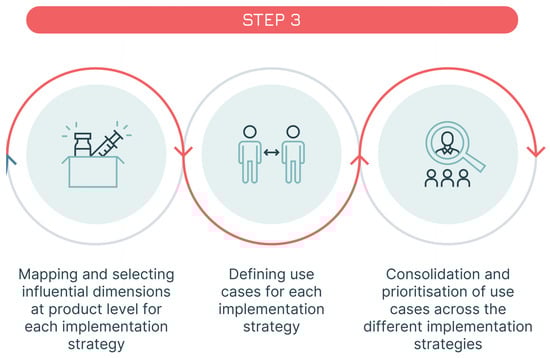 - Step 3: The three fits are assessed a second time, focusing, within each implementation strategy, on the specific field situations in which the vaccine is used, e.g., the user–product interaction. This step leads to the identification of vaccine use cases. The three Ws relevant at the user level are revisited, shifting the focus from groups and generic settings to individual users and vaccination sites, i.e., redefining the who (as the vaccinator), the whom (as the vaccinee) and the where (as the location of the administration).