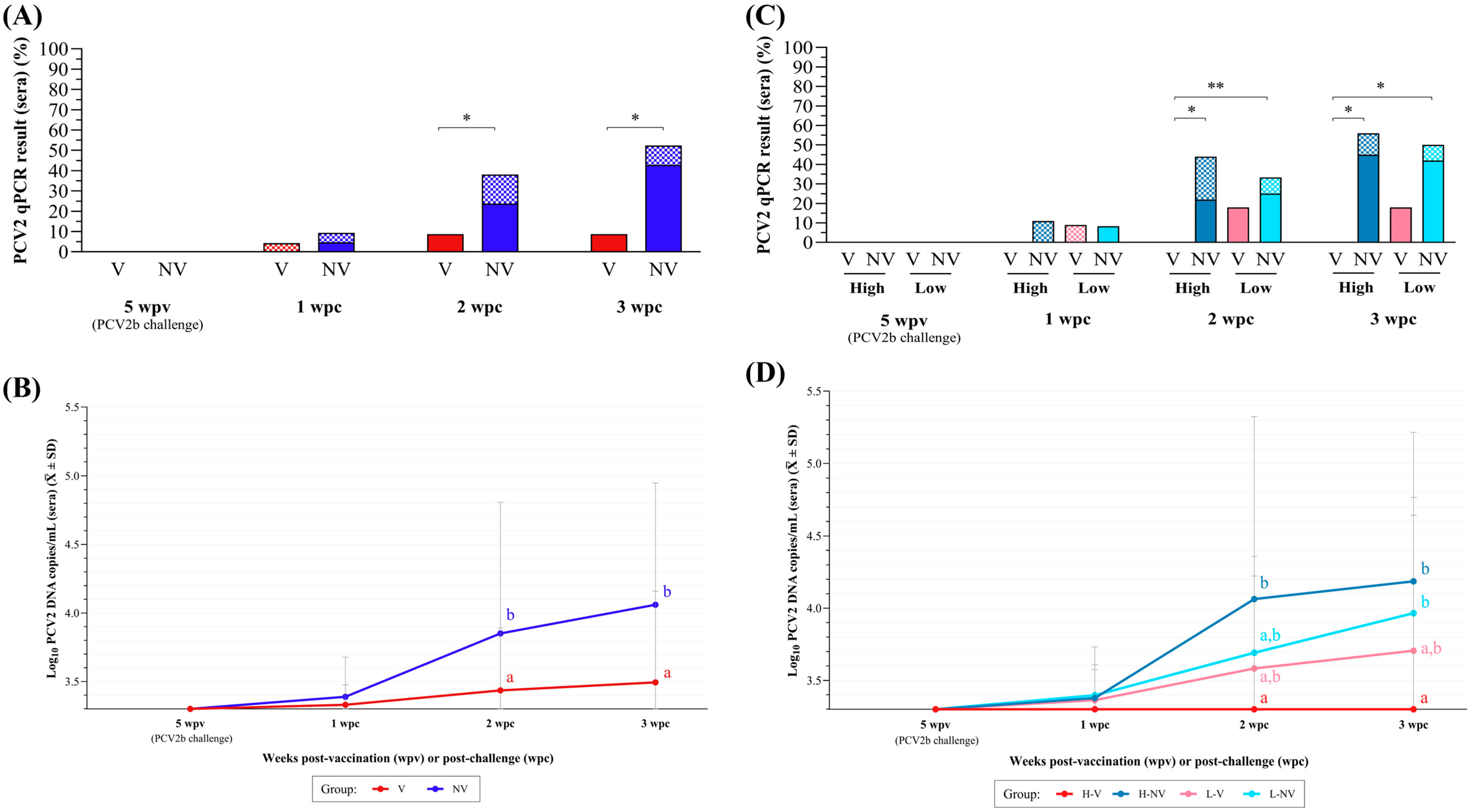- Venegas-Vargas, C.; Taylor, L.P.; Foss, D.L.; Godbee, T.K.; Philip, R.; Bandrick, M. Cellular and humoral immunity following vaccination with two different PCV2 vaccines (containing PCV2a or PCV2a/PCV2b) and challenge with virulent PCV2d. Vaccine 2021, 39, 5615–5625. [Google Scholar] [CrossRef]