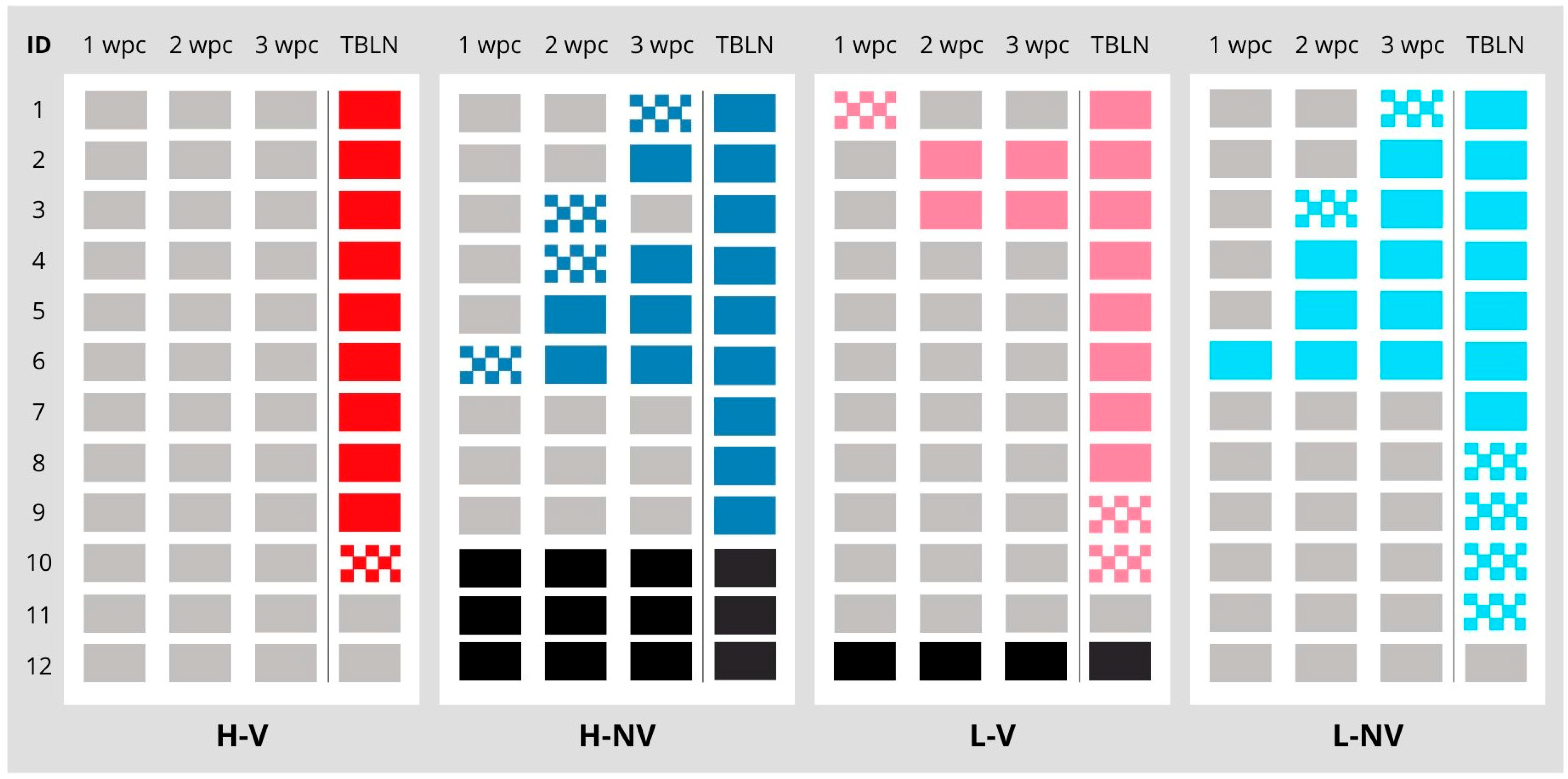 L-NV | 6/12 a,b (50.0%) | 1/12 a (8.3%) | 4/12 a (33.3%) | 1/12 a,b (8.3%) |
