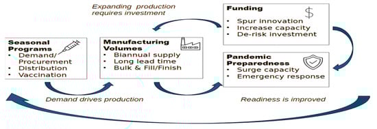 Vaccine manufacturers possess specialized knowledge about production, logistics and innovation but they are often not actively involved in top-level public health decision-making, leading to less informed strategies and the risk of slower implementation of critical solutions during a crisis. Furthermore, to overcome the absence of market-driven predictability, a robust pandemic preparedness strategy requires clear economic incentives and effective risk mitigation to mobilize vaccine manufacturers. Thus, vaccine industry participation in pandemic influenza preparedness is underpinned by a combination of public health imperatives and economic incentives. Governments and international agencies recognize that the private sector’s agility, manufacturing capacity, and innovation pipelines are indispensable for rapid vaccine development and deployment [11,12], and most also concede that this is not a classical market and hence requires specific risk mitigation mechanisms.