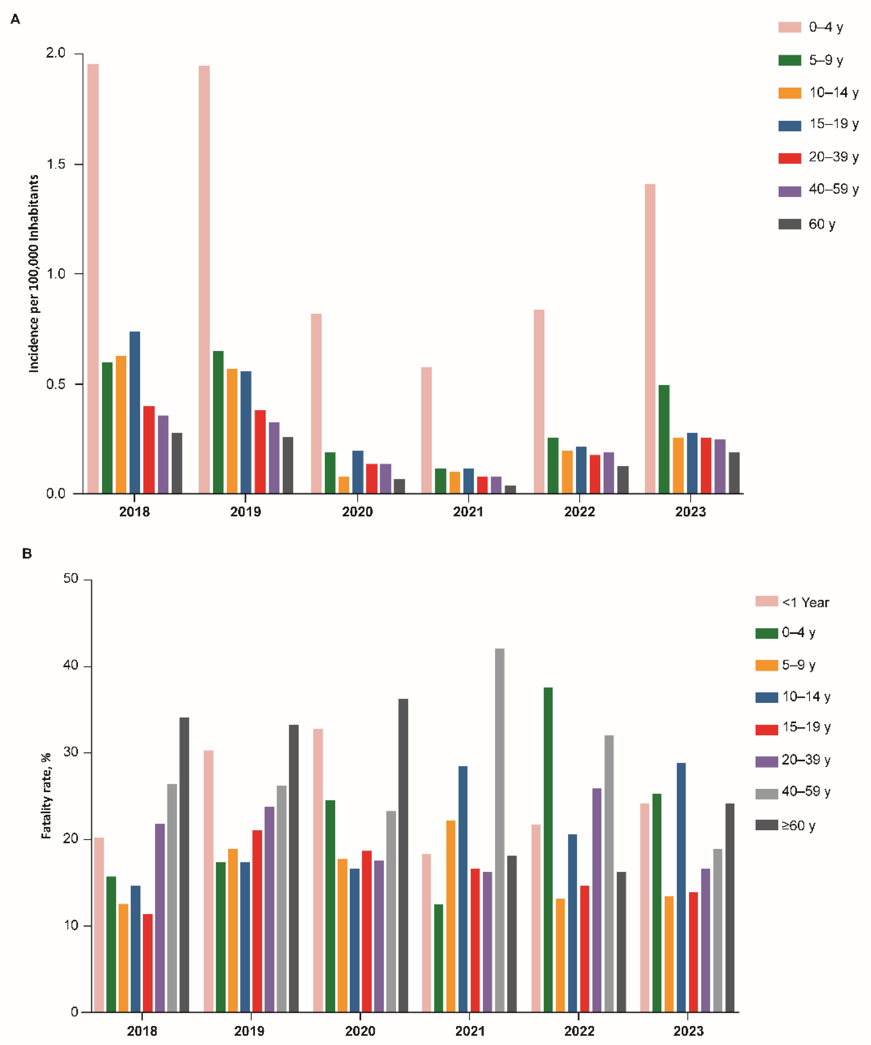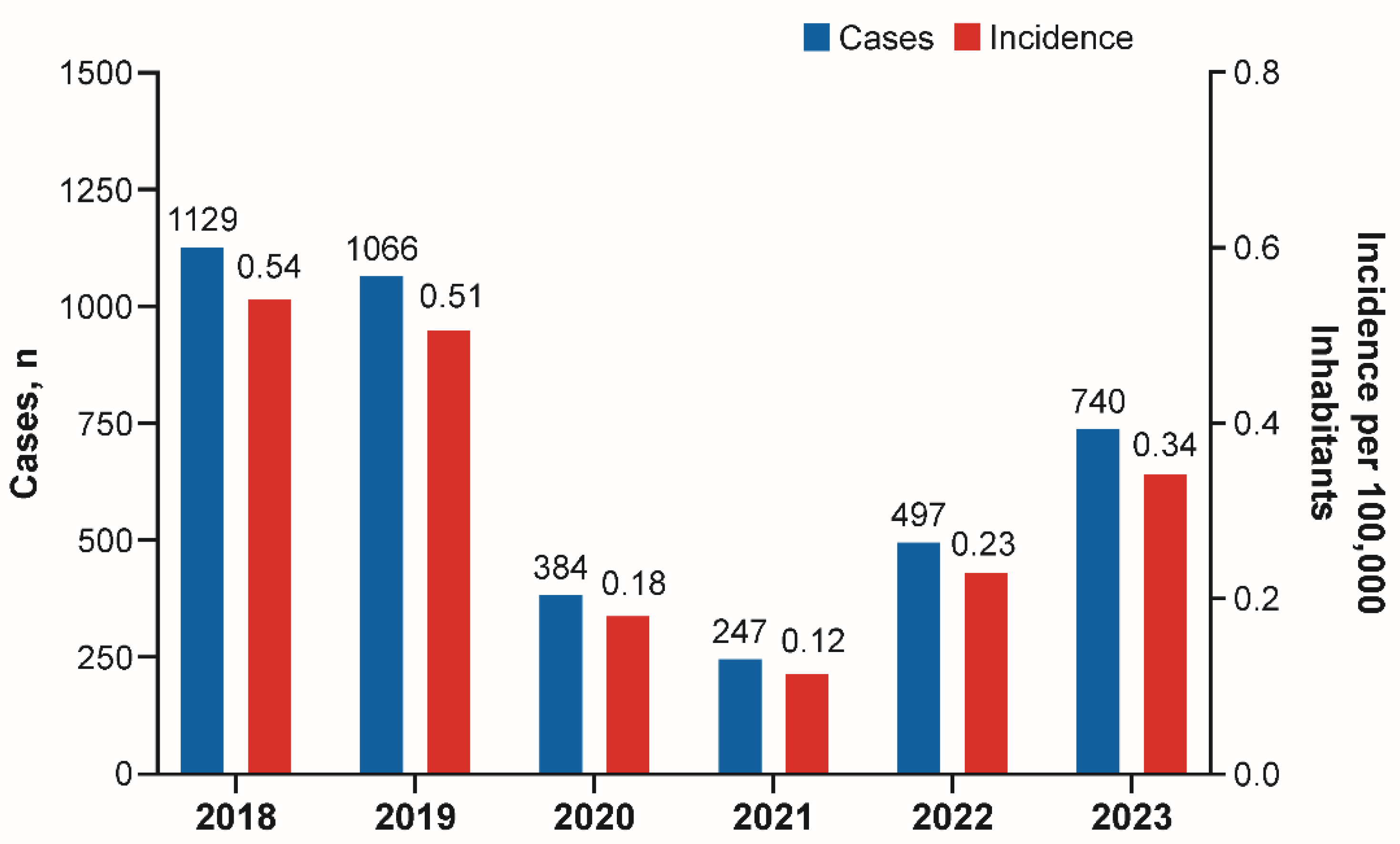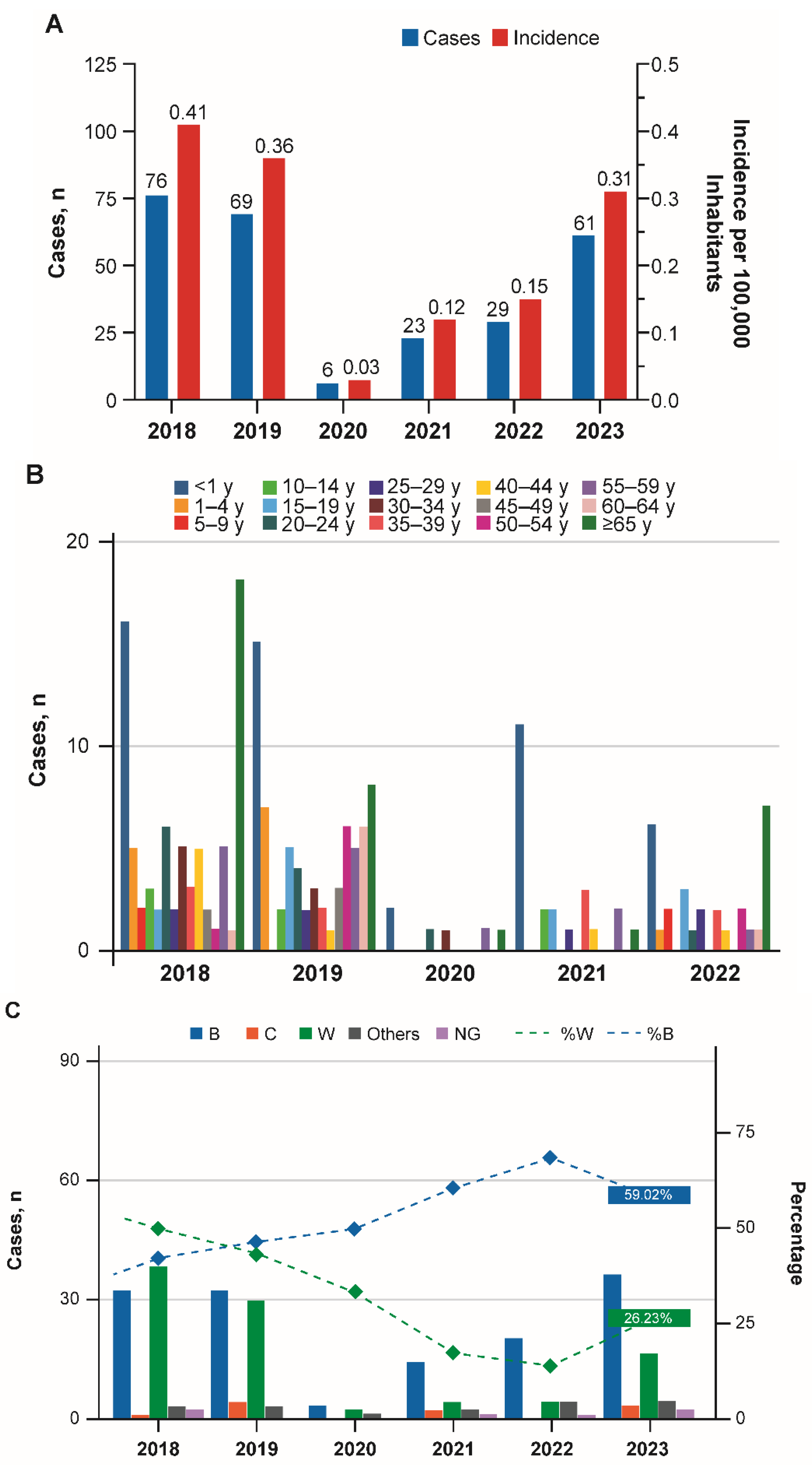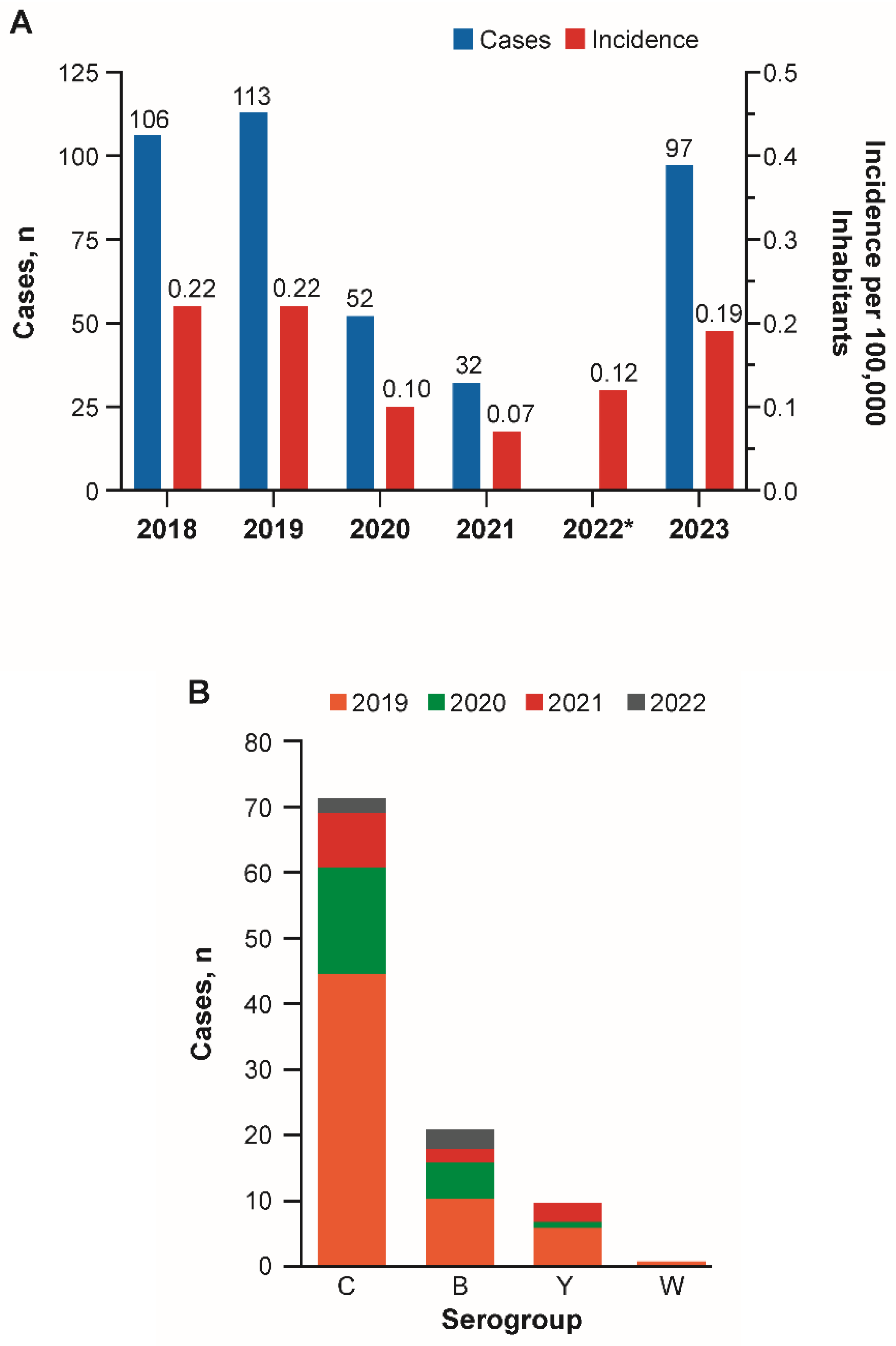 | Year | Total Cases, n | Incidence *,† | Serogroup, %* | ||||