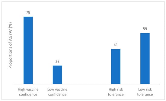 We further report that the source of income was associated with vaccine confidence and risk tolerance. The AGYW who had no source of income were more likely to be vaccine-confident than those who were employed. AGYW with formal employment and those receiving support/assistance showed significantly lower vaccine confidence than the participants with informal or no source of income. The association between socioeconomic status and vaccine confidence is multifactorial [38]. Our finding that low socioeconomic status was associated with vaccine confidence could demonstrate the trust in healthcare systems, which in Africa often provide vaccines for free or at low cost, coupled with fewer resources to access alternative information sources that fuel VH (e.g., online misinformation) [39,40].