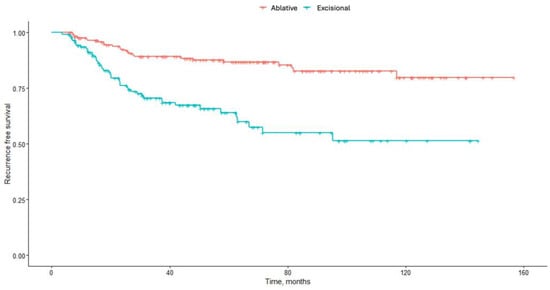 Recurrence-free survival after treatment (in red, ablative treatment; in blue, excisional treatment).