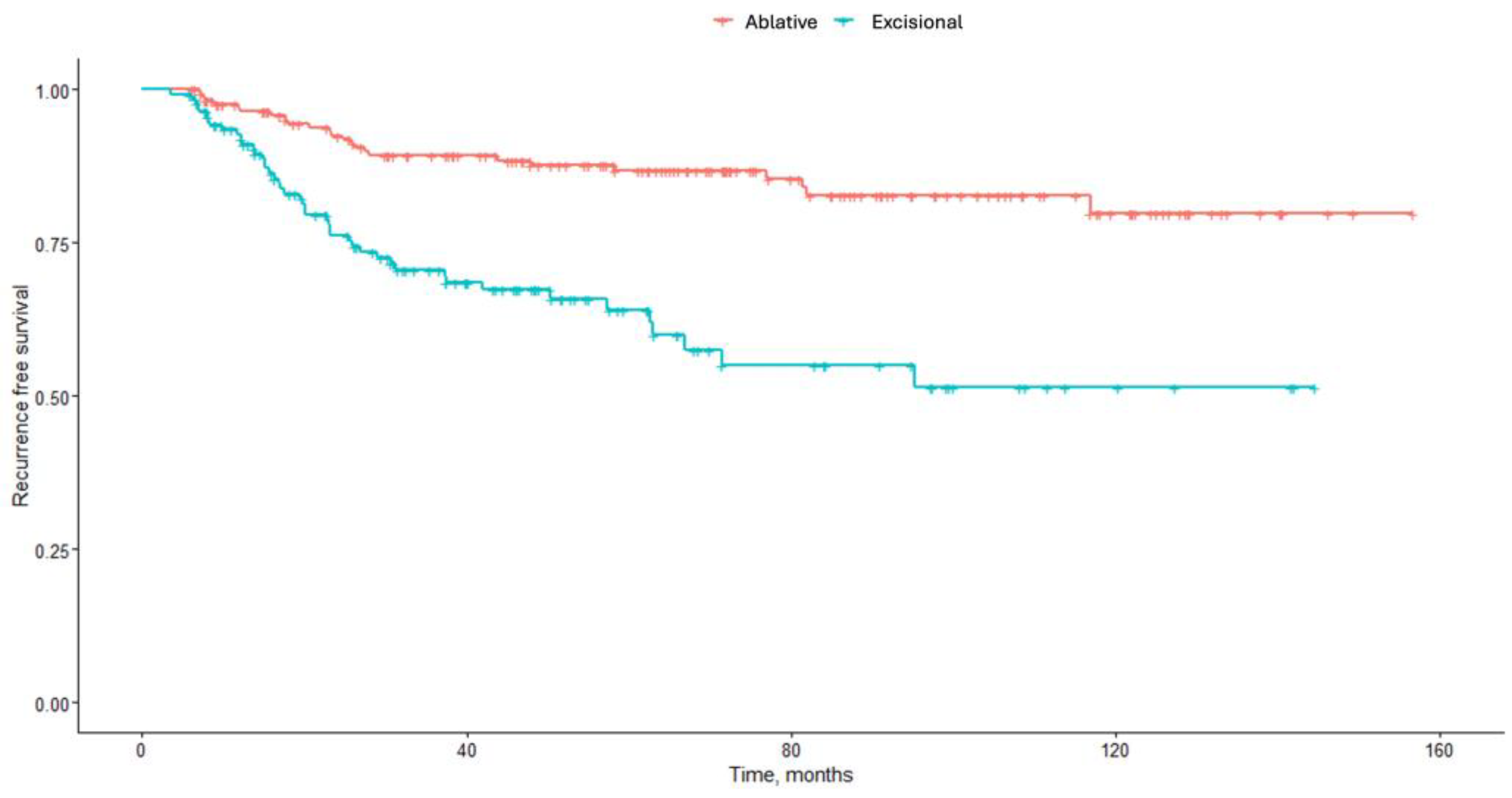 Figure 1. Recurrence-free survival after treatment (in red, ablative treatment; in blue, excisional treatment).