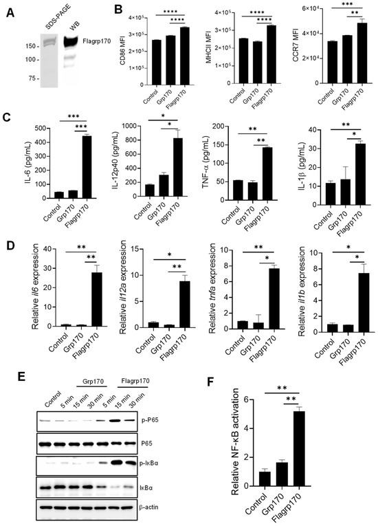 To examine the immunostimulatory activity of the chimeric Flagrp170 molecule, we first prepared the recombinant Flagrp170 protein using a baculovirus–insect cell expression system [14,21]. The integrity and purity of the protein was confirmed through the Coomassie staining and immunoblotting (Figure 1A, Supplementary File S2. original images and relative signal intensity A). Similarly to other molecular chaperones, Flagrp170 also showed preferential binding for professional APCs, e.g., DCs (Figure S1). When compared to bone marrow-derived DCs treated with parental unmodified Grp170, DCs treated with the newly created chimeric chaperone Flagrp170 displayed higher expressions of antigen-presenting molecule MHC II, co-stimulation molecule CD86, and chemokine receptor CCR7, which can facilitate the migration of activated DCs (Figure 1B) [22]. Additionally, Flagrp170 protein was more efficient than Grp170 in stimulating the production of pro-inflammatory or immunostimulatory cytokines by DCs, including IL-6, IL-12p40, TNF-α, and IL-1β (Figure 1C). Consistent with the ELISA results, qRT-PCR showed that gene transcription of il6, il12a, tnfa, and il1b were also sharply increased upon Flagrp170 treatment (Figure 1D). Since the chimeric Flagrp170 contains a defined sequence for NF-κB activation that is critical for the immunostimulatory function of DCs [23,24,25], we next examined its NF-κB-stimulating activity upon interaction with DCs. Immunoblotting analysis revealed that Flagrp170 protein efficiently induced an activation of the NF-κB signaling pathway, evidenced by the increased phosphorylation of P65 as well as the increased degradation of IκBα, associated with its phosphorylation (Figure 1E, Supplementary File S2. original images and relative signal intensity B). We further determined the NF-κB-stimulating activity of Flagrp170 using dual luciferase reporter assays. HEK293 cells stably expressing TLR5 were transfected with an NF-κB-firefly luciferase reporter plasmid and a constitutively active thymidine kinase–renilla luciferase reporter plasmid, followed by stimulation with Grp170 or Flagrp170. We showed that Flagrp170, not unmodified Grp170, was able to activate NF-κB, as indicated by the significant elevation of luciferase activity (Figure 1F).