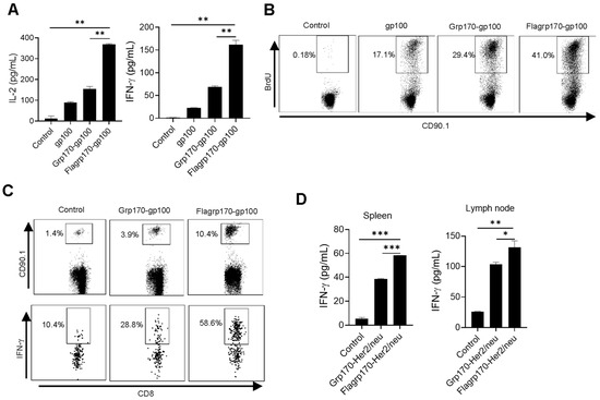 Bone marrow-derived dendritic cells (DCs) were generated by culturing the mouse bone marrow cells in the presence of mouse GM-CSF from PeproTech (Rocky Hill, NJ, USA) [17]. Chaperone–antigen protein complexes were prepared as previously described [14]. Briefly, recombinant gp100 protein was incubated with Grp170 or Flagrp170 protein (1:1 molar ratio) at 45 °C for 30 min, followed by incubation at 37 °C for an additional 30 min. DCs were then pulsed with chaperone–antigen complexes (30 µg/mL) for 4 h and washed prior to co-culture with Pmel mouse-derived CD8+ T cells (1:5 ratio) for 72 h in 200 µL RPMI 1640 medium containing BrdU (10 µM/mL) in a round-bottom 96-well microtiter plate. T cell proliferation and activation was assessed by ELISA and flow cytometry analysis.