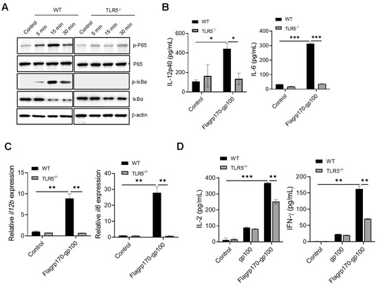 Given that flagellin serves as a pathogen-associated molecular pattern recognized by TLR5 [27,28], we examined the potential involvement of TLR5 in the Flagrp170-enhanced activation of DCs. Upon the stimulation of wild-type (WT) or TLR5−/− DCs with Flagrp170 protein, we showed that the loss of TLR5 abolished the ability of Flagrp170 to induce the phosphorylation of P65 and IκBα (Figure 3A, Supplementary File S2. original images and relative signal intensity C). Additionally, Flagrp170-stimulated TLR5−/− DCs produced significantly less cytokines (i.e., IL-12p40, IL-6) when compared with WT counterparts (Figure 3B), which was associated with the significantly reduced transcription of these cytokine genes in TLR5−/− DCs (Figure 3C). Given that the NLR family CARD domain-containing protein 4 (NLRC4) inflammasome also recognizes intracellular flagellin [29], we also examined the potential involvement of NLRC4 in Flagrp170-enhanced DC activation. We showed that the lack of NLRC4 in DCs did not appear to have an effect on Flagrp170-stimulated cytokine production (Figure S3), supporting TLR5 as a major mediator of Flagrp170-enhanced DC activation. To determine the TLR5 dependence of Flagrp170 activity in the setting of antigen cross-presentation, we loaded WT or TLR5−/− DCs with the Flagrp170-gp100 complex, and co-cultured them with gp100-specific CD8+ Pmel T cells. It was shown that the TLR5 deficiency significantly reduced the capability of DCs to stimulate the activation of Pmel T cells, evidenced by the decreased levels of cytokines IL-2 and IFN-γ present in the supernatant (Figure 3D). These results suggest that TLR5 on DCs is necessary for Flagrp170-enhanced DC activation and its subsequent T cell-stimulating function.