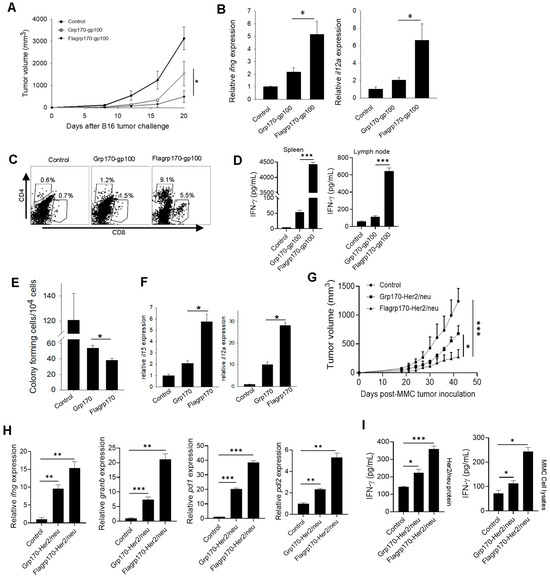 We next examined the therapeutic activity of the Flagrp170-gp100 complex as a cancer vaccine. C57BL/6 mice established with B16 melanoma were immunized with the Flagrp170-gp100 complex, Grp170-gp100 complex, or were left untreated. We showed that treatment with the Flagrp170-gp100 vaccine resulted in the more effective inhibition of tumor growth compared to treatment with the Grp170-gp100 vaccine (Figure 4A). The qRT-PCR analysis of tumor tissues revealed that Flagrp170-gp100 immunization significantly elevated Th1 immunity-related cytokine genes, including ifng and il12a (Figure 4B). The FACS analysis further showed that Flagrp170-gp100 vaccination resulted in an increased tumor infiltration by both CD4+ cells and CD8+ cells (Figure 4C), particularly IFNγ-expressing CD8+ T cells (Supplementary Figure S4A), when compared with Grp170-gp100 vaccination, suggesting an improved ability of this chimeric Flagrp170 molecule to mobilize adaptive immune cells infiltrating and remodeling the tumor compartment. Similar observations were also made when luciferase was used as a model antigen for complexing with Flagrp170 in the treatment of mice with luciferase-expressing B16 tumors (Supplementary Figure S4A,B). Additionally, we showed that splenocytes or tumor-draining lymph node cells from Flagrp170-gp100 vaccinated mice produced significantly higher levels of INF-γ upon stimulation with gp10025–33 peptide than those from the Flagrp170-gp100 vaccinated mice (Figure 4D), suggesting a superior Flagrp170 activity in inducing a systemic antigen-specific T cell response.