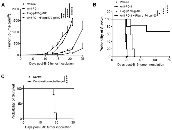 Given the ability of the Flagrp170 chaperone vaccine to expand tumor-reactive T cells and immunologically remodel the tumor sites, we sought to examine its potential use for improving tumor responses to ICIs. C57BL/6 mice established with B16 melanoma were treated with the Flagrp170-gp100 complex, anti-PD-1 antibodies, or a combination. We showed that, while anti-PD-1 therapy alone failed to inhibit tumor progression, a combinatorial treatment resulted in the highly potent suppression of tumor growth (Figure 6A), which corelated with significantly prolonged animal survival (Figure 6B). Strikingly, approximately 60% of mice receiving combination therapy remained tumor-free (Figure 6B), suggesting a curative effect of the Flagrp170-gp100 complex vaccine in combination with anti-PD-1 therapy. These tumor-free mice were re-challenged with B16 tumors 90 days later and none of these mice developed tumors (Figure 6C), suggesting that a robust memory response has been established following the combination therapy.