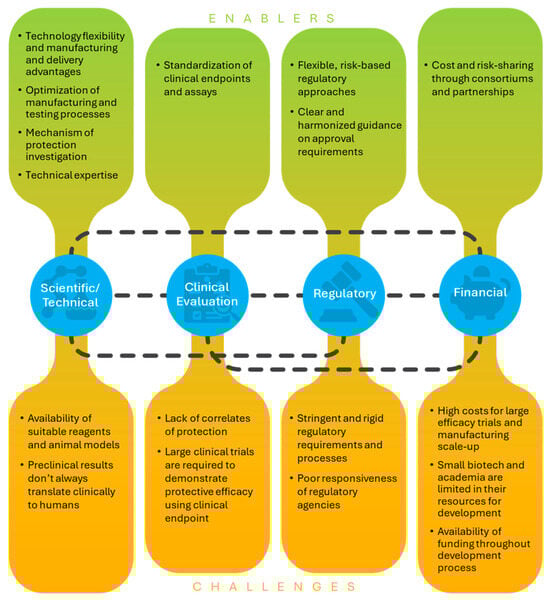 Drawing on lessons from recent rapid-response vaccine platforms, the path forward calls for scientific, regulatory, and financial barriers to be addressed. Overcoming these challenges requires sustained collaboration among developers, regulators, funders, and global health stakeholders. Clearer regulatory guidance, harmonized evaluation criteria, and validated correlates of protection are essential to facilitate the development and licensure of novel vaccine platforms. At the same time, targeted and sustained funding across all stages of development—particularly for advanced clinical trials—will be critical to ensure promising candidates reach the market.